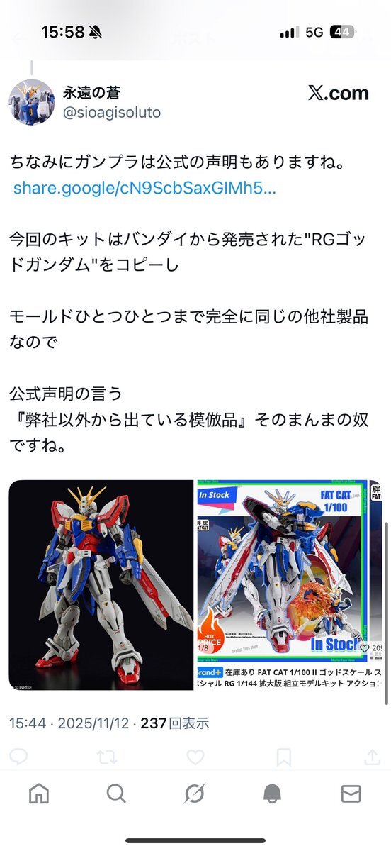 @sioagisoluto コメ欄封鎖で逃げてやがる バンダイが指摘しているのは具体的にどれってのではないし 何より対応しないぞってだけなんだが #ガンプラ #海賊版 #版権 トイガンなんか版権無視はスルーって言う pic.x.com/t4YCMSCQCC