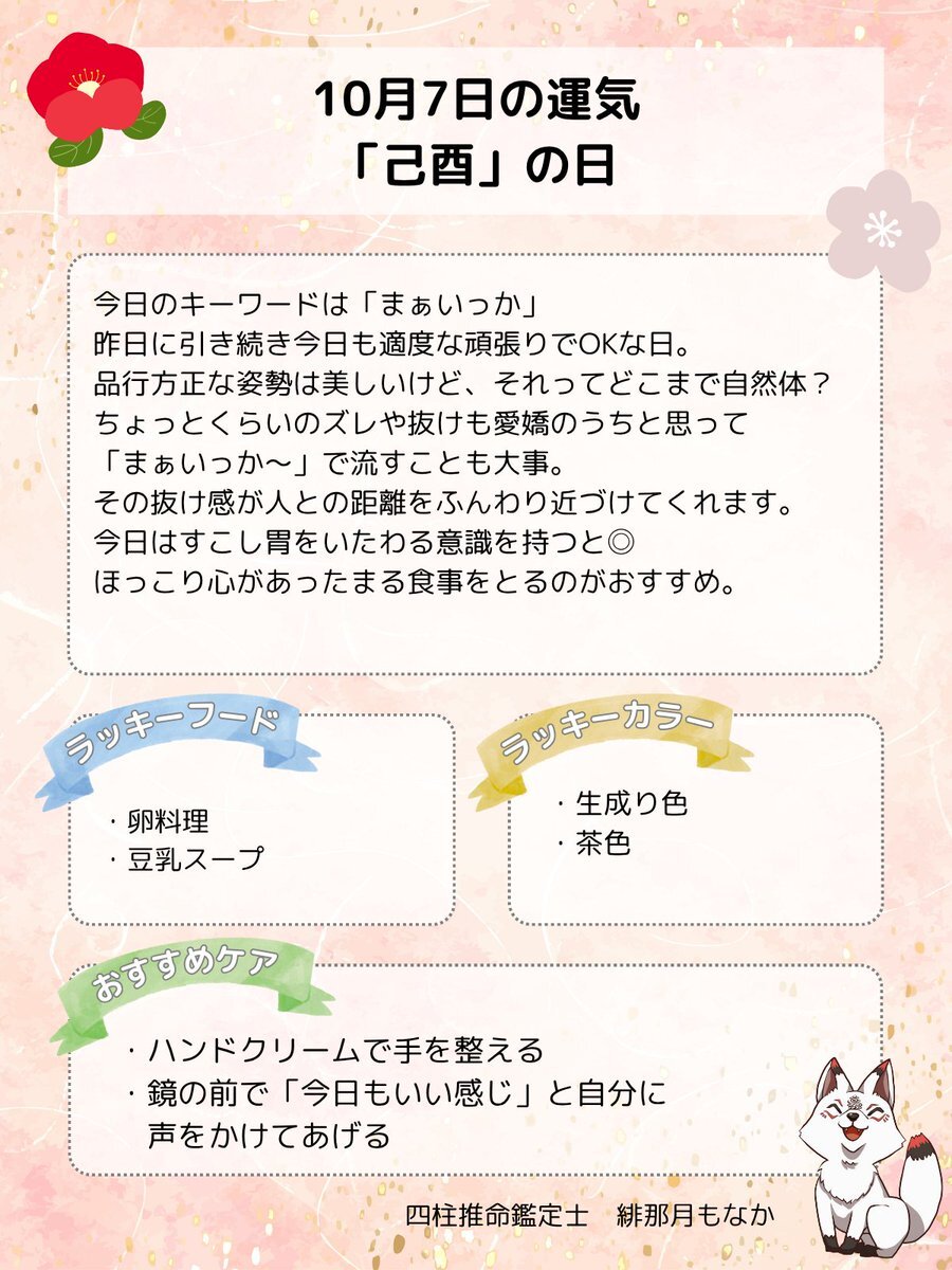 おはようございます🌷 今日は #牡羊座満月 の日。 物事が一区切りついたり、新しい方向性が見えてきたりするタイミング。 何か変えたい、変わりたいことはありますか? 私は自分のpostがもっと役に立てて 面白いって思ってもらえるようになりたいな!✨ 今日も良い一日を🌸 #四柱推命 pic.x.com/K432wxKF6d