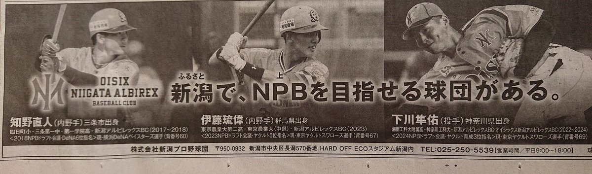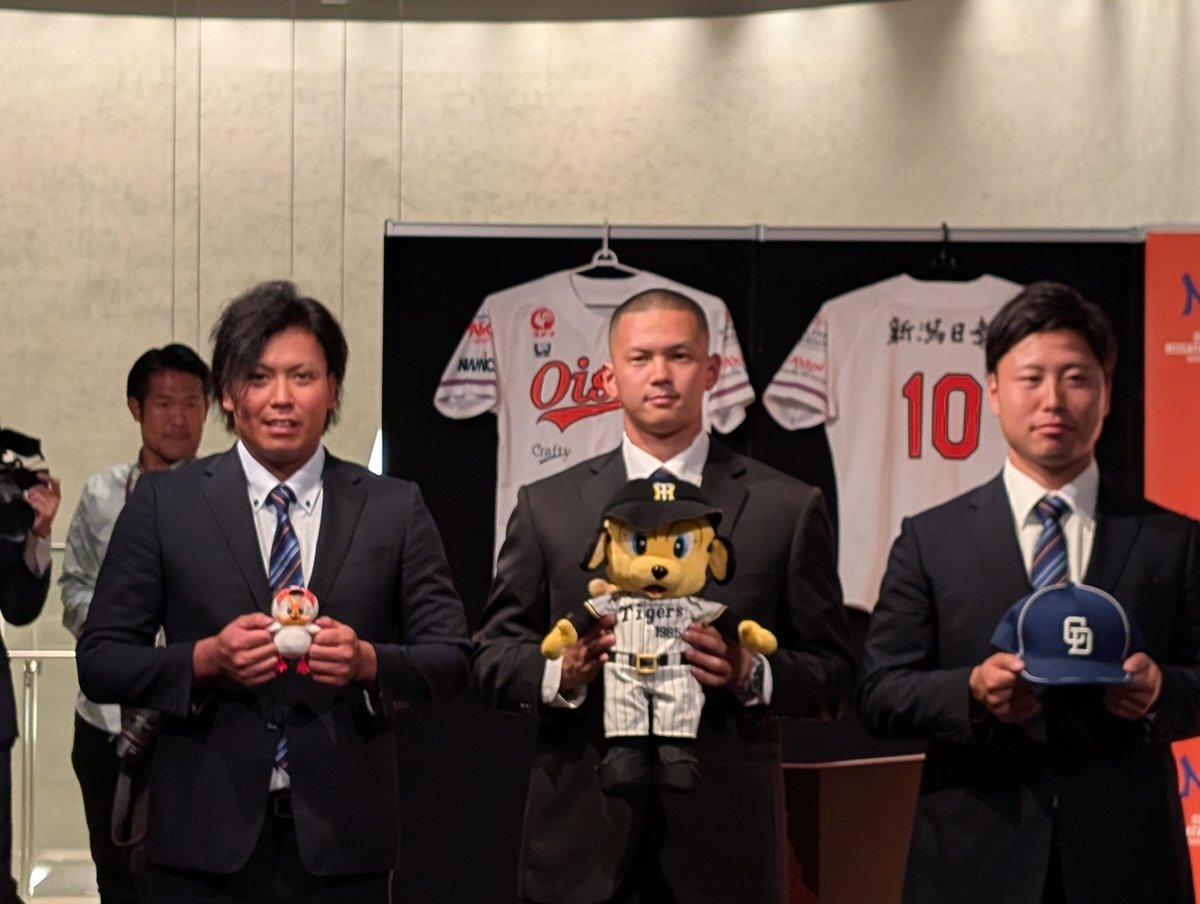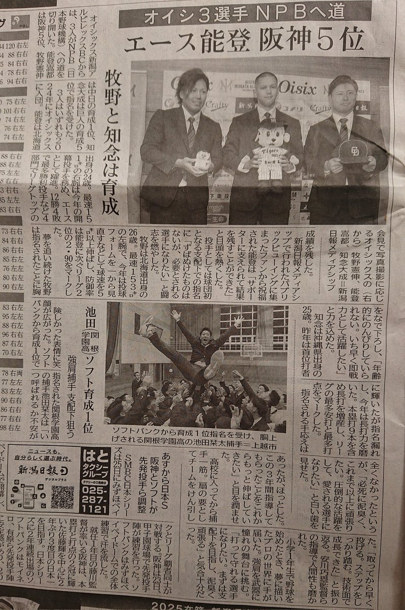 昨日のドラフト会議にてオイシックス新潟アルビレックスBCからは… 阪神5位 #能登嵩都 中日育成1位 #牧野憲伸 巨人育成5位 #知念大成 3名の指名を頂きました✨✨ 能登選手は投手として球団初の支配下指名! 牧野選手、知念選手は悲願のNPB入りとなりました! #オイシックス新潟アルビレックスBC pic.x.com/0D3jVd5ZBp