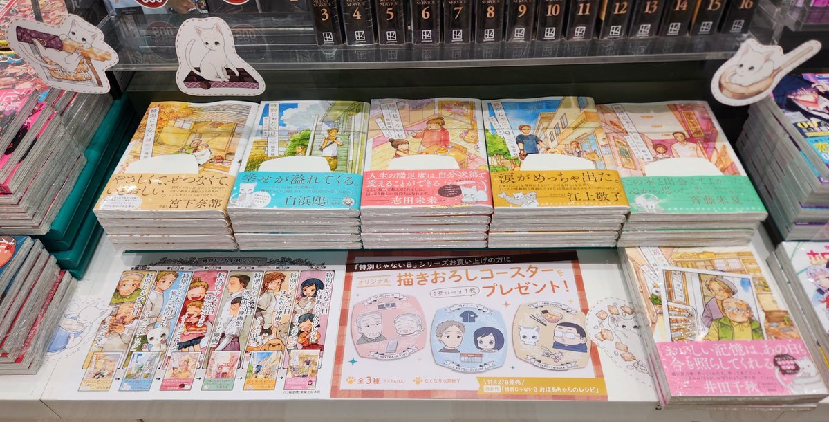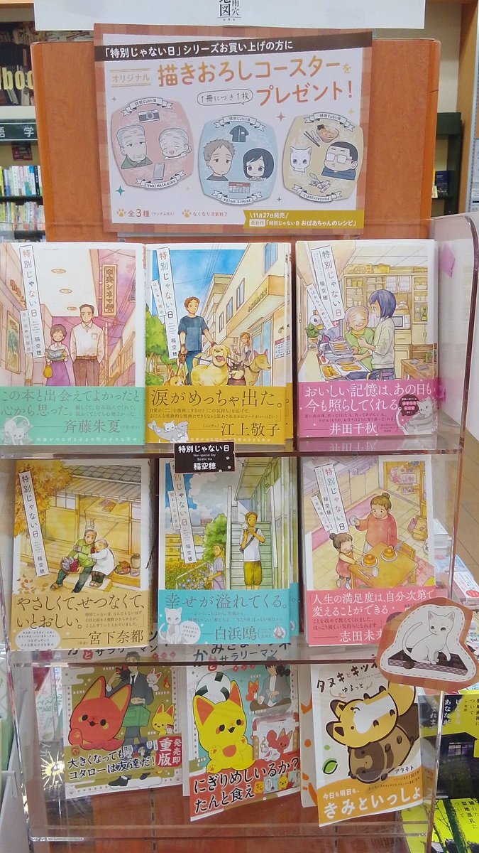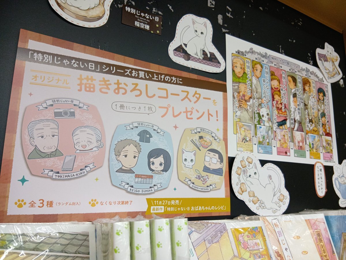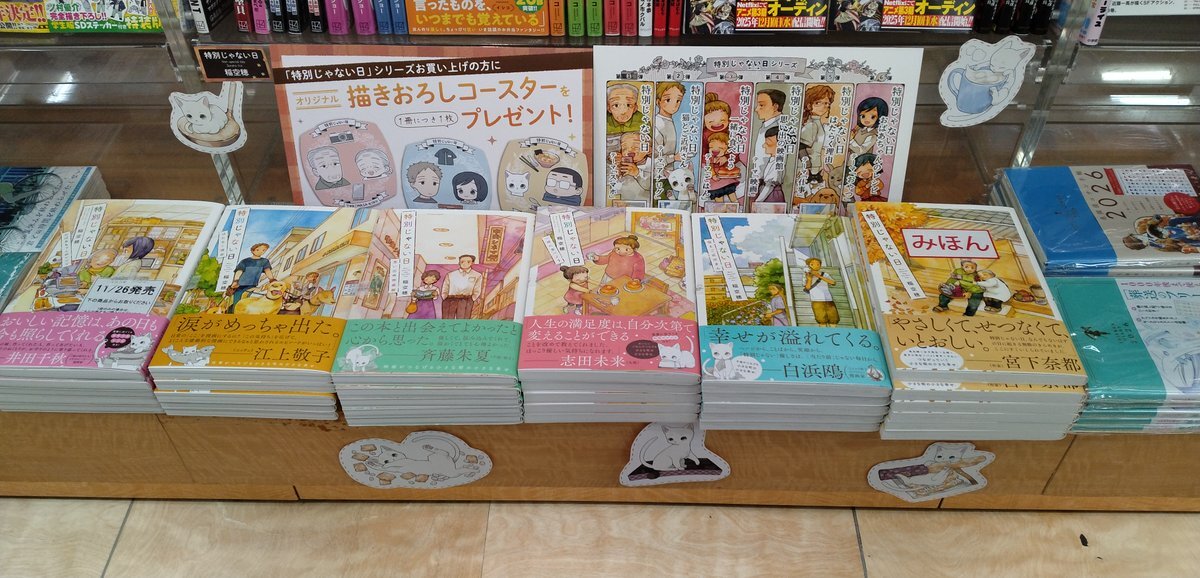 『特別じゃない日』フェア開催中です! ただいまご購入の方に特典コースターをプレゼント❤(ランダムで1枚封入済みです!)最新6巻は心温まる「おばあちゃんのレシピ」😸あなただけの“特別じゃない日”を見つけてみてくださいね🥰 #稲空穂 #実業之日本社 #特別じゃない日ディスプレイコンテスト pic.x.com/Y2Xz1go2Ta
