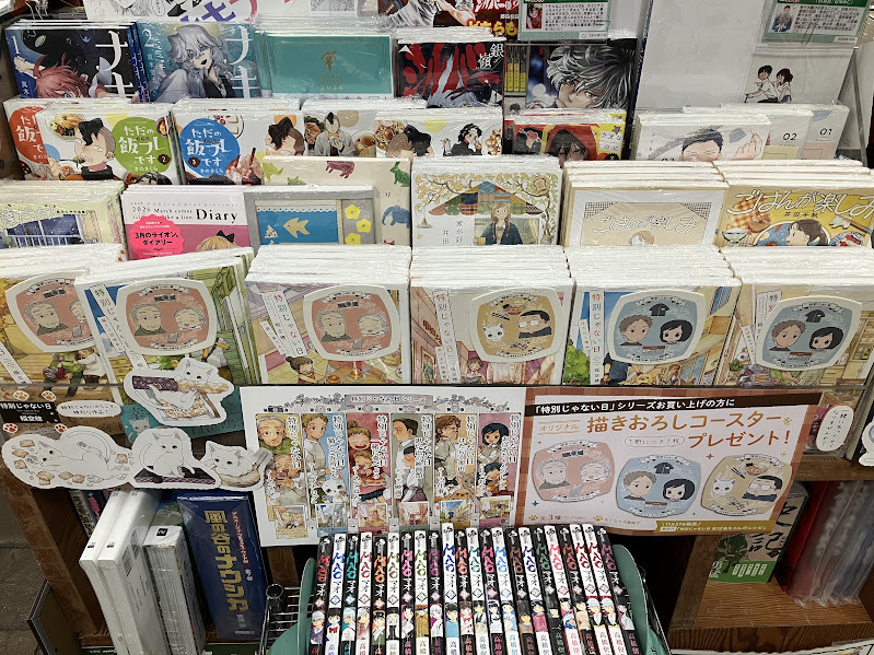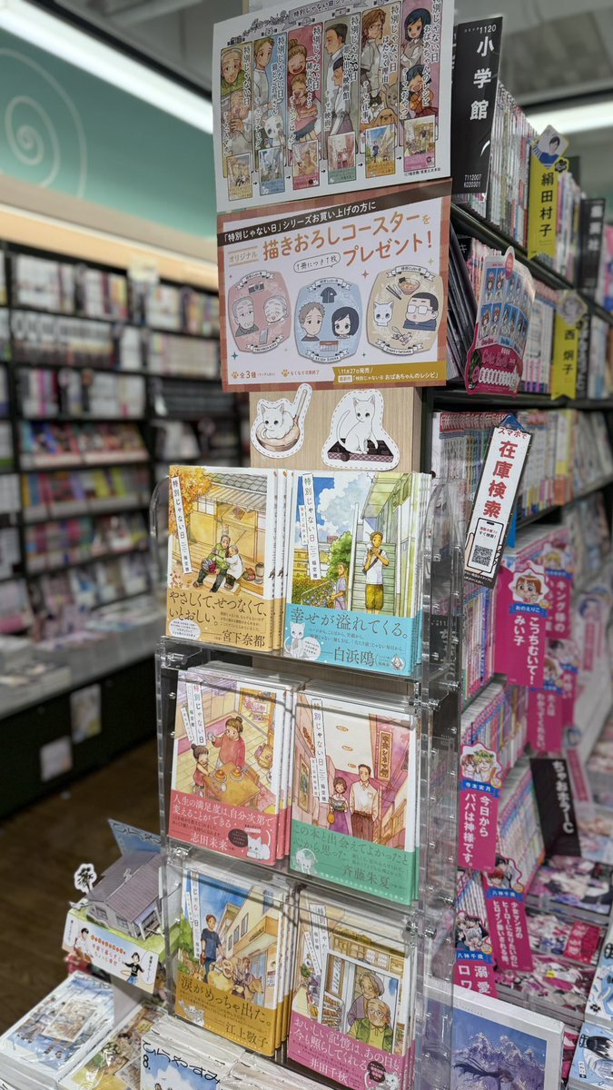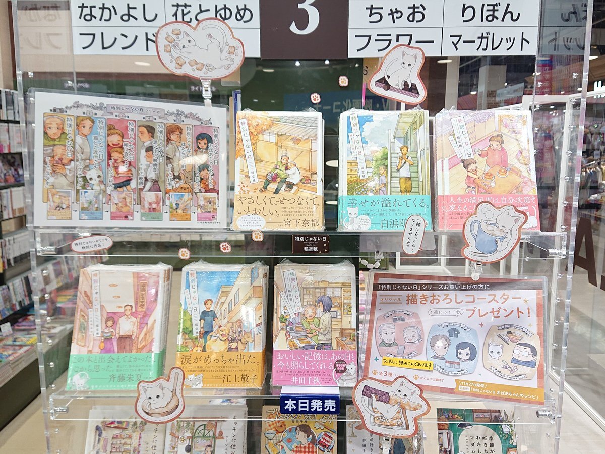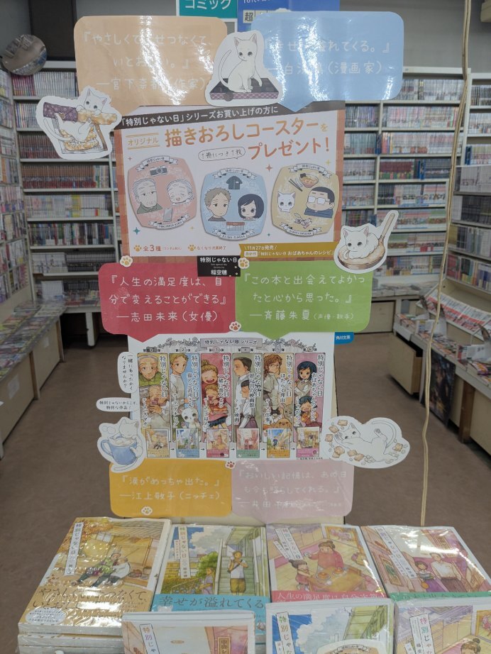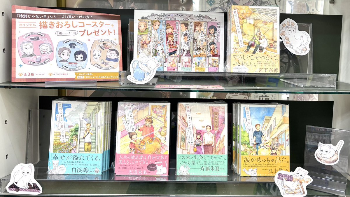 『特別じゃない日』フェア開催中です! ただいまご購入の方に特典コースターをプレゼント❤(ランダムで1枚封入済みです!)最新6巻は心温まる「おばあちゃんのレシピ」😸あなただけの“特別じゃない日”を見つけてみてくださいね🥰 #稲空穂 #実業之日本社 #特別じゃない日ディスプレイコンテスト pic.x.com/Y2Xz1go2Ta