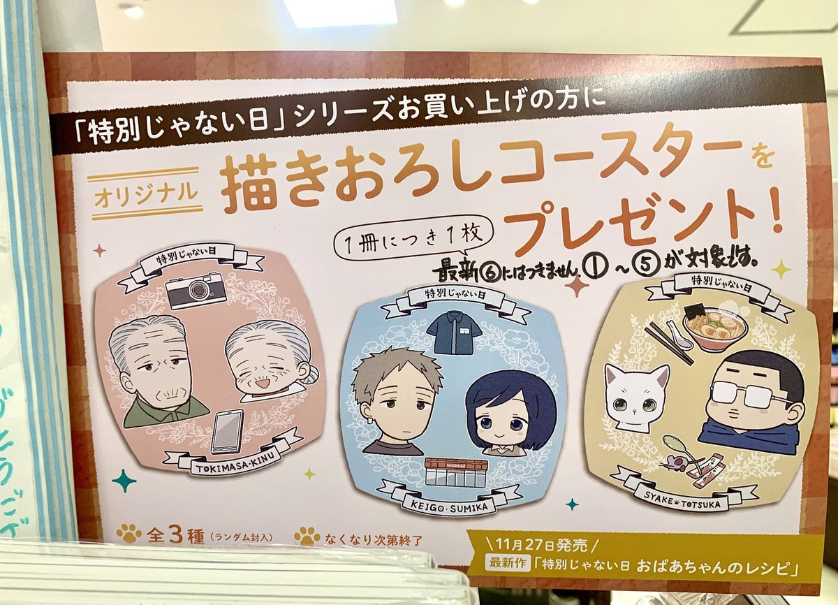 【本日入荷】 ⭐️ 特別じゃない日 おばあちゃんのレシピ 🔴特典 イラストカード 新刊発売記念フェア開催中! 特別じゃない日(稲空穂/実業之日本社)既刊1巻~最新6巻をお買い上げのお客様に数量限定「特製描き下ろしコースター」をプレゼント! #特別じゃない日ディスプレイコンテスト pic.x.com/DCQp2C0rkX