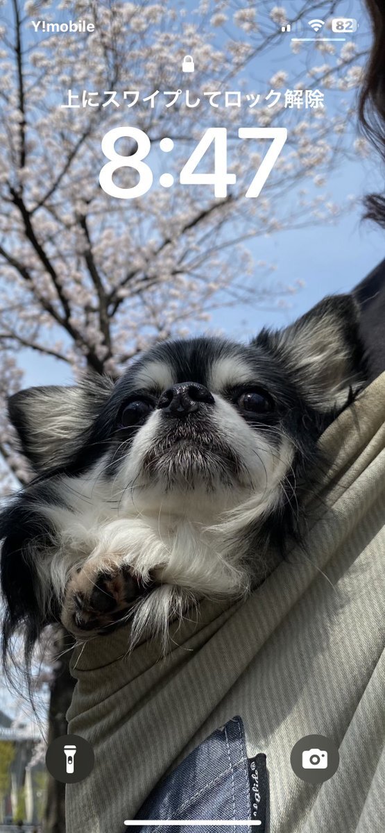 今日のロック画面 一見キリッとしたぐりちゃん。でも前足がちょっと出てるしそもそもスリングの中(笑)。 ぐりちゃんはほんとに男前。イケメンだったなぁ。 #ぐり #秘密結社老犬倶楽部天国支部 #犬との思い出 pic.x.com/Q5AIycsWTi