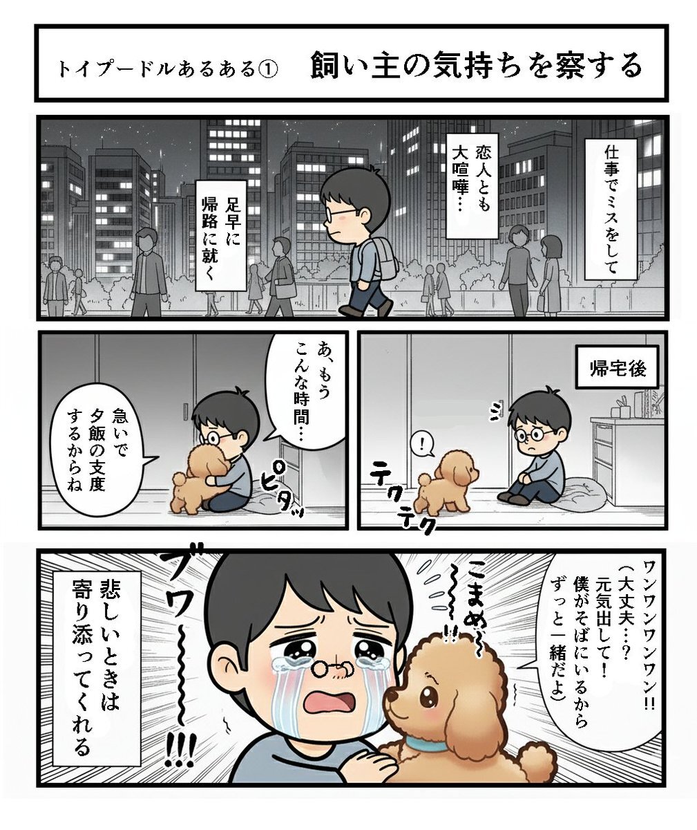 トイプードルあるある① ~飼い主の気持ちを察する~ 犬が好きすぎて4コマ漫画描いちゃいました。 #トイプードル #トイプードル部 #トイプードル好きな人と繋がりたい #犬漫画 #犬4コマ #わんこ漫画 #犬のいる暮らし #犬好きさんと繋がりたい #犬マンガ #犬の気持ち #いぬすたぐらむ #ペット漫画 pic.x.com/WRqRPWrddL