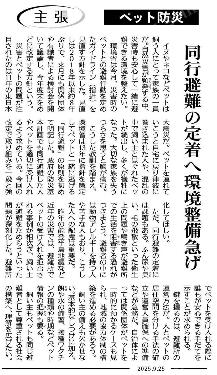 🐾ペット防災 9/25付 #公明新聞 に「同行避難の定着へ環境整備急げ」📰 私も6月議会で一般質問し、市内のペット同行避難の強化を提案✍️ ペットも大切な家族。安心して一緒に避難できる環境づくりをこれからも後押しします🐶 #ペット防災 #同行避難 #同伴避難 #犬を飼う第一選択肢を保護犬に pic.x.com/oAS9suu8nk