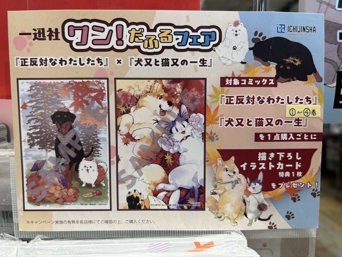 / 📣𝐍𝐞𝐰𝐬🐾 一迅社 ワン!だふるフェア開催決定🐶 『正反対なわたしたち』✖『犬又と猫又の一生』 \ 𝟏𝟏/𝟏(土)から順次開催❣️ 🔻開催店舗 ・TSUTAYA(一部店舗除く) ・コーチャンフォー各店 ・その他全国書店 対象作品を𝟏点購入ごとに 描き下ろしイラストカード𝟏枚お渡し🍁