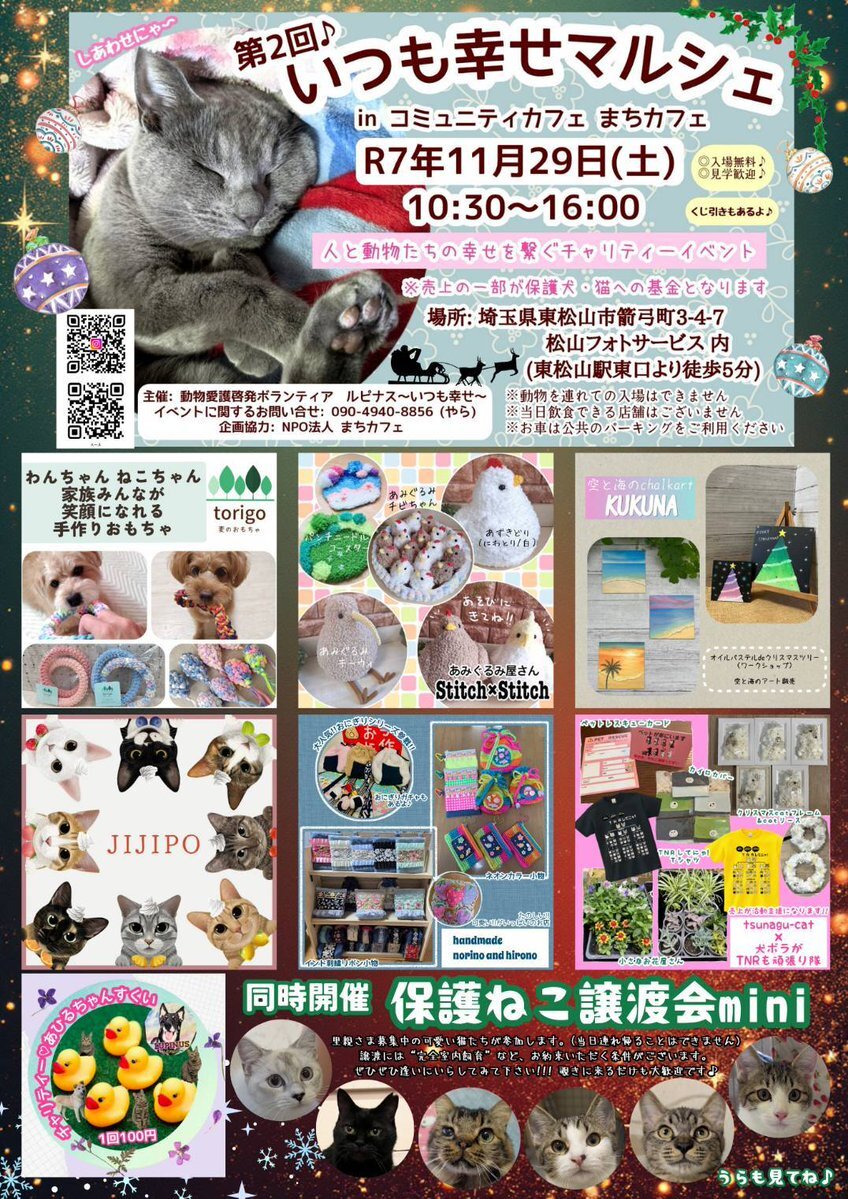 明日、10時30分〜16時、東武東上線「東松山駅」から徒歩5分、松山フォトサービス内・コミュニティカフェまちカフェにてお待ちしております✨️ とっても可愛いワンコ服も破格販売いたします。お洋服の売上の全額が保護犬・保護猫のチャリティー基金となります。 #犬服 #保護犬 #保護猫 #まちカフェ pic.x.com/cVV1gwQSKN x.com/kemuchans/stat…