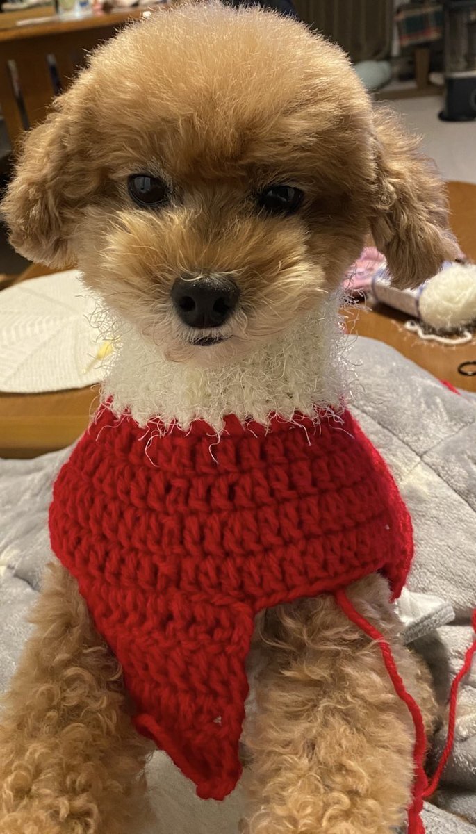 わんこのサンタ風の服🎅 いい感じ! 赤い毛糸1玉しかなくて絶対足りないのはわかってたけど… 後は全部白にしようかなぁ 赤を買ってくるかなぁ どうしようかなぁ それにしても凛々しいお顔✨かわいい〜💗 #編物 #犬服 #サンタさん pic.x.com/1Qi3aSTxjk