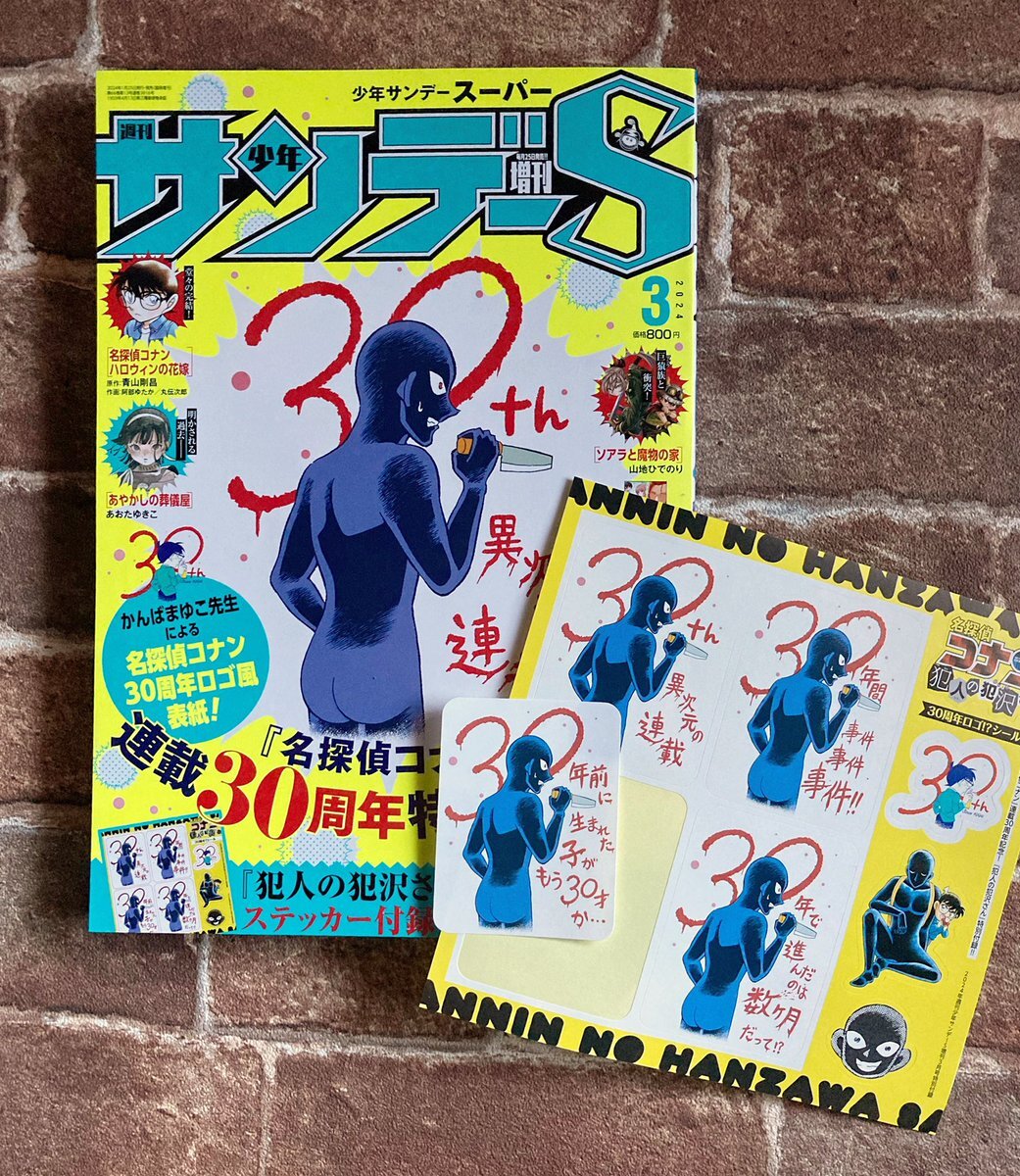 本日発売❗️サンデーS3月号 『名探偵コナン』連載30周年記念号! 30周年記念ロゴ風犯沢さん表紙! ふろくは犯沢さんステッカー‼️ #犯人の犯沢さん 特別編 「犯人達の30thお祝いパーティー」 #コナン30周年 pic.x.com/hJlAF9uaJi
