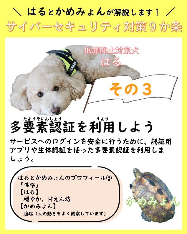 【犯罪抑止対策犬の“はる🐩”とお友達の“かめみょん🐢”が解説😊サイバーセキュリティ対策9か条】 ~その③~多要素認証を利用しよう! #三重県警察 #サイバー #サイバーセキュリティ #犯罪抑止対策犬 # #トイプードル # #カメ pic.x.com/fnghI2PLiP