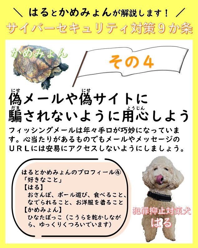 【犯罪抑止対策犬の“はる🐩”とお友達の“かめみょん🐢”が解説😊サイバーセキュリティ対策9か条】 ~その④~偽メールや偽サイトに騙されないように用心しよう! #三重県警察 #サイバー #サイバーセキュリティ #犯罪抑止対策犬 # #トイプードル # #カメ pic.x.com/CcVRjMr8u9