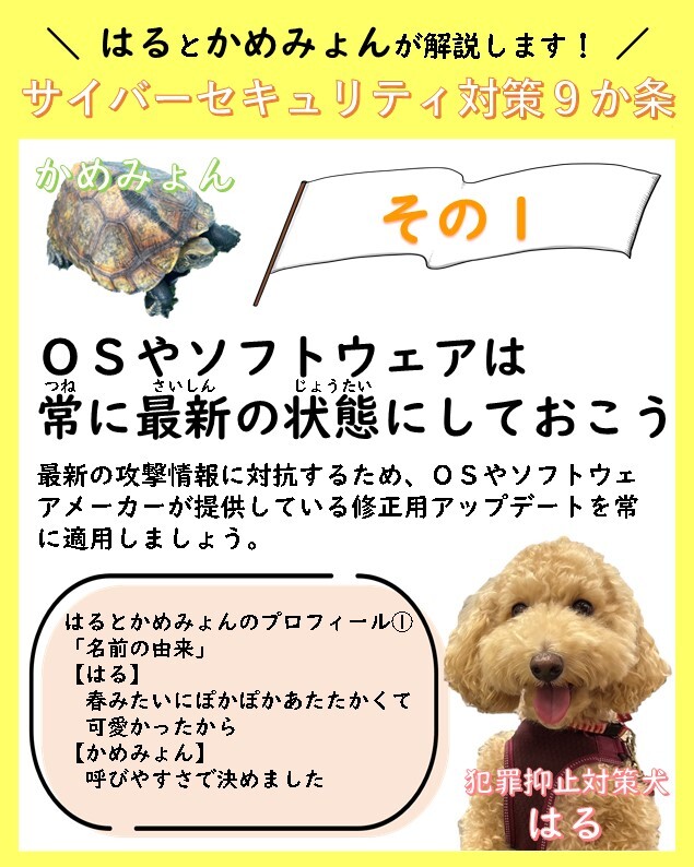 【犯罪抑止対策犬の“はる🐩”とお友達の“かめみょん🐢”が解説😊サイバーセキュリティ対策9か条】 ~その①~OSやソフトウェアは常に最新の状態にしておこう! #三重県警察 #サイバー #サイバーセキュリティ #犯罪抑止対策犬 # #トイプードル # #カメ pic.x.com/HRWbDVoT9t