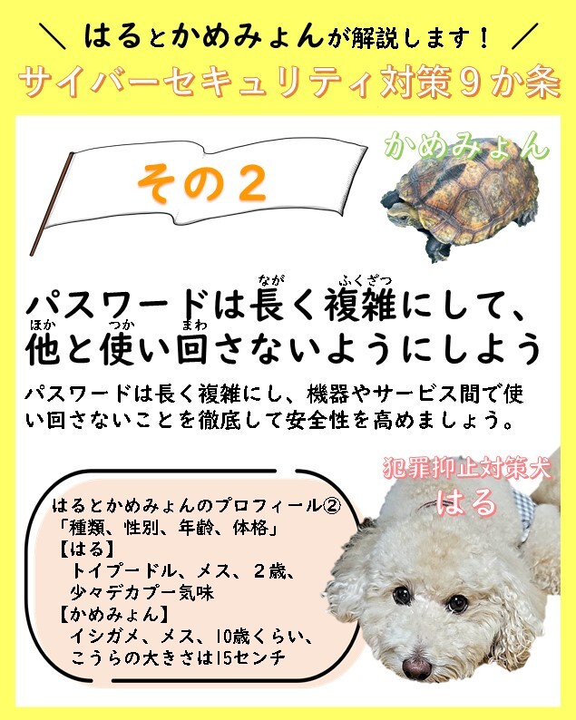 【犯罪抑止対策犬の“はる🐩”とお友達の“かめみょん🐢”が解説😊サイバーセキュリティ対策9か条】 ~その②~パスワードは長く複雑にして、他と使いまわさないようにしよう! #三重県警察 #サイバー #サイバーセキュリティ #犯罪抑止対策犬 # #トイプードル # #カメ pic.x.com/1M3DekQVtF