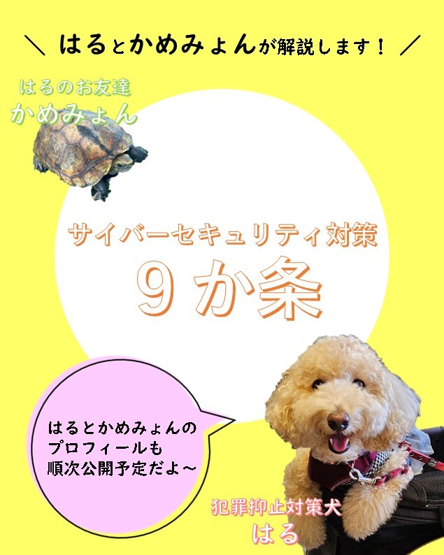 【🐩サイバーセキュリティ対策9か条をご紹介🐢】 これから毎週、犯罪抑止対策犬の“はる”とお友達の“かめみょん”が解説していきます😉基本的なセキュリティの考え方・対策について、一緒に確認しましょう✨ #三重県警察 #サイバー #サイバーセキュリティ #犯罪抑止対策犬 # #トイプードル # #カメ pic.x.com/fbEdJkxuCK