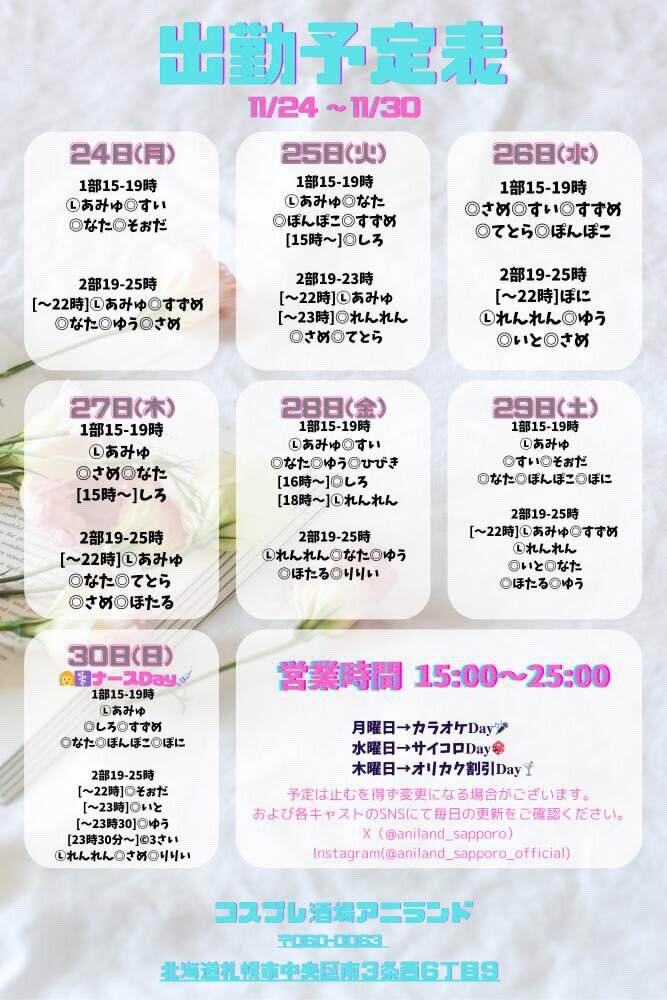 𓈒𓏸𓐍𓈒𓏸𓐍 アニランドオープン👾✨ 1部2部営業です☀️ 𓈒𓏸𓐍𓈒𓏸𓐍 🖤11月29日(土) 🖤1部 15:00~19:00 🖤2部 19:00~25:00 #アニランド #コスプレ #札幌 #狸小路 #コンカフェ #コスプレバー 𓈒𓏸𓐍𓈒𓏸𓐍 pic.x.com/Lux3J2EXRt