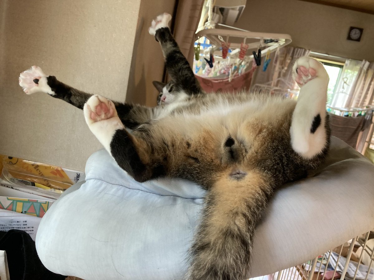 ヘソ天時の彦十郎さんの異常な関節の柔らかさからくるおっぴろげも凄いけれど、縞九郎さんの足真っ直ぐ直立ヘソ天もなんだか凄い というか君たち、どんな姿勢をとりたいの? #猫のいる暮らし𓏲𓎨 #猫と楽しく暮らそう pic.x.com/0S4WnUN97J
