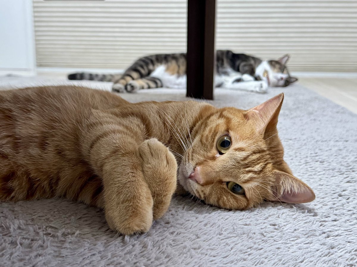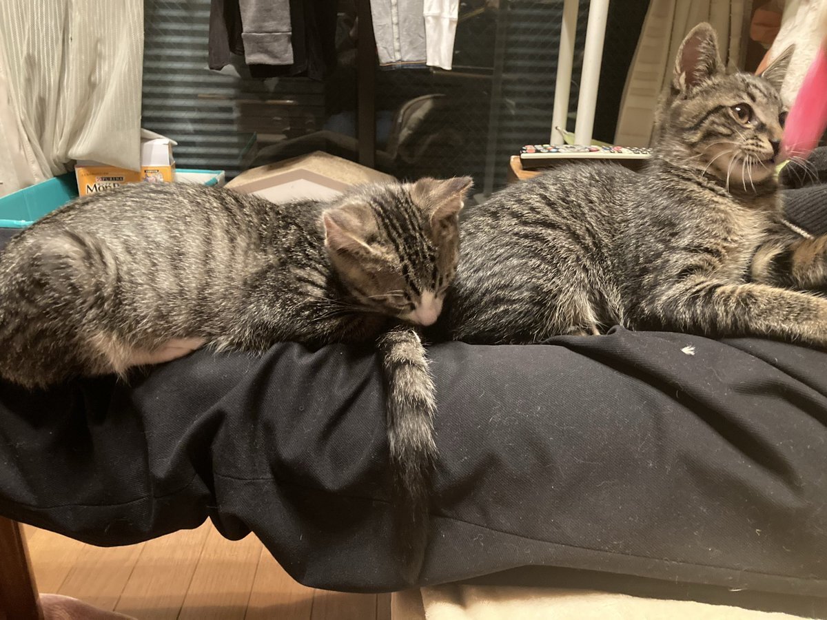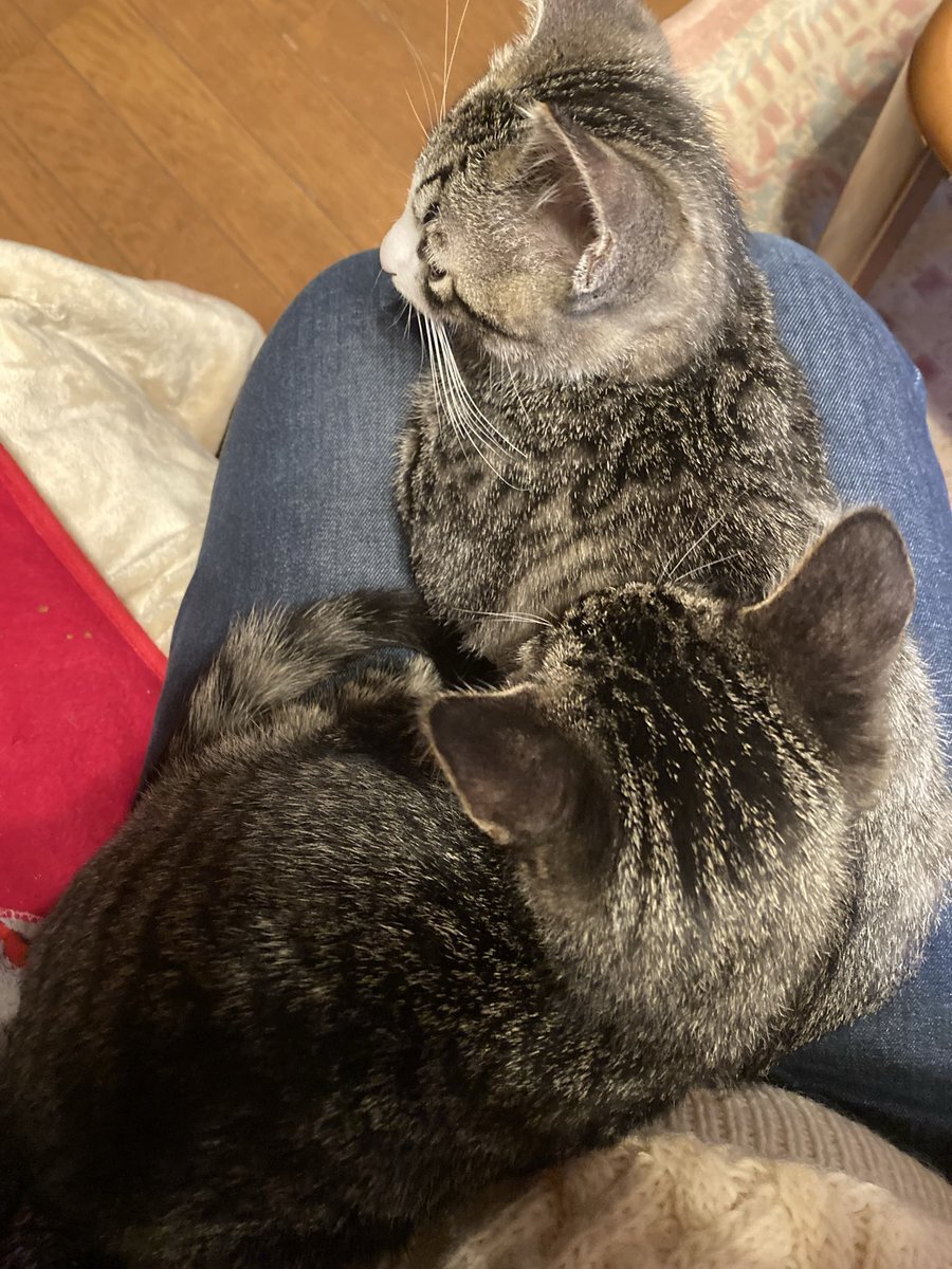 琥太郎クンの頭から虎徹クンが生えてる🐈💕 2匹とも微妙な距離で同じような感じでお寛ぎ中だった🤭 #子猫妖精ドビー #ねこかわいいね #ねこのいる暮らし𓏲𓎨 #猫 #猫と楽しく暮らそう pic.x.com/IpnDv2ymgn
