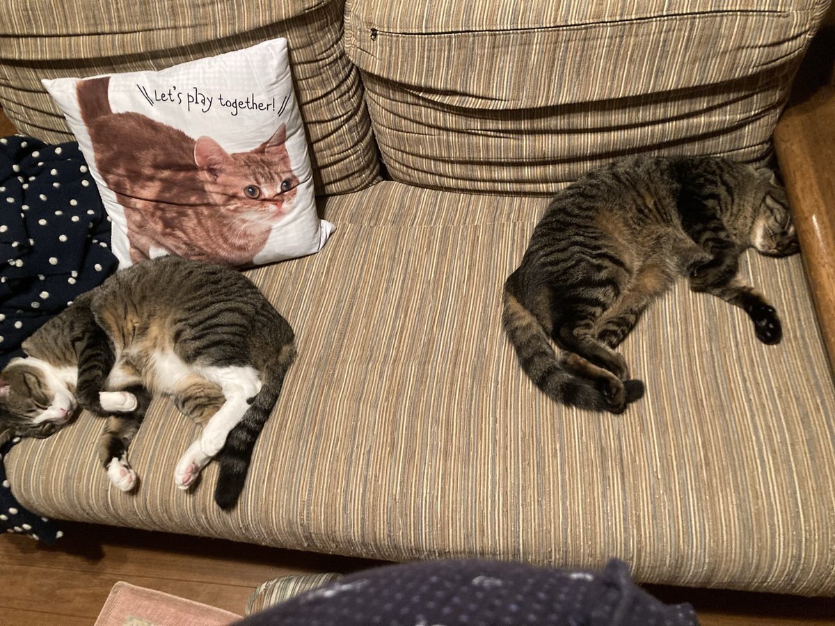 このソファに落ちている縞九郎さんと彦十郎さんの間の真ん中の隙間に座って、ずっと携帯を弄っていた訳ですよ📱 🐈⬛ 両手にキジ猫男子 🐈⬛ #猫のいる暮らし𓏲𓎨 #猫と楽しく暮らそう pic.x.com/mU24TBgTMF