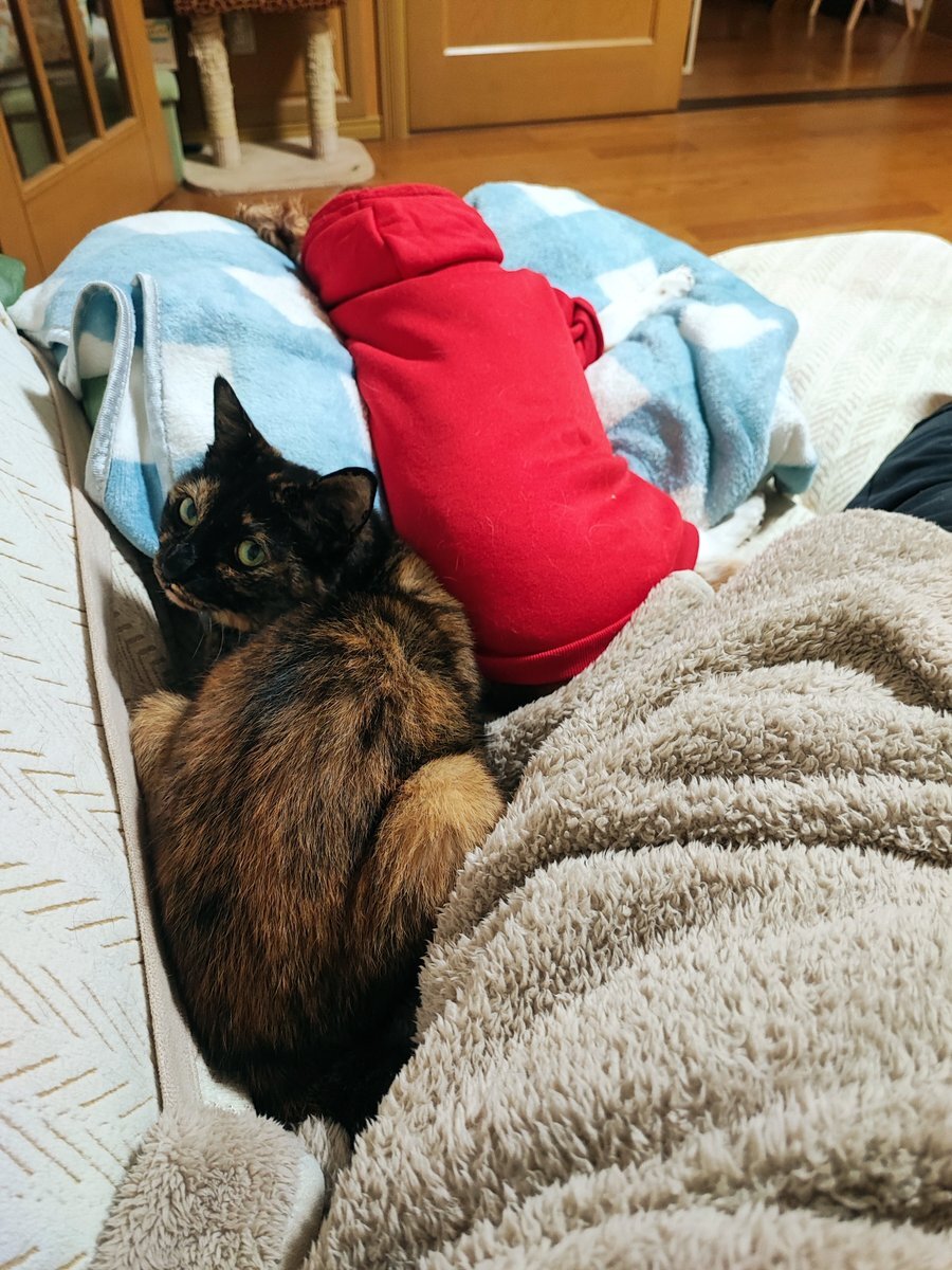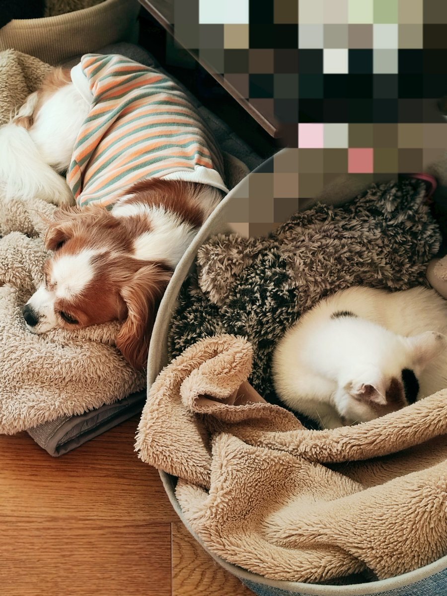 ちょいちょいモモがマドモアゼルまどの巣にちょっかい出してんなーと思ったら、あんかのカバーにゲボしてた。意外とこの2匹は仲良いというか、モモさんがまぁまぁまどのこと好きなんよねぇ…フード吐くから…() #犬のいる暮らし #猫のいる暮らし #猫と犬のいる暮らし pic.x.com/zrRrqqRR14