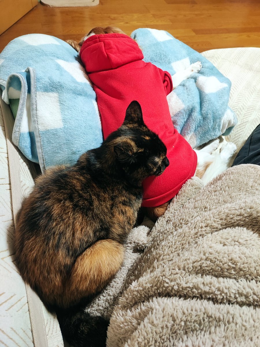 今日の仲良し❣️あ、そしてももこ🍑乱入🙀今季1番寒い朝ホカペの優しい温かさをよく知ってらっしゃる🐕‍🦺🐈 🚙🌬️👋 #猫と犬のいる暮らし pic.x.com/1auY522Drt