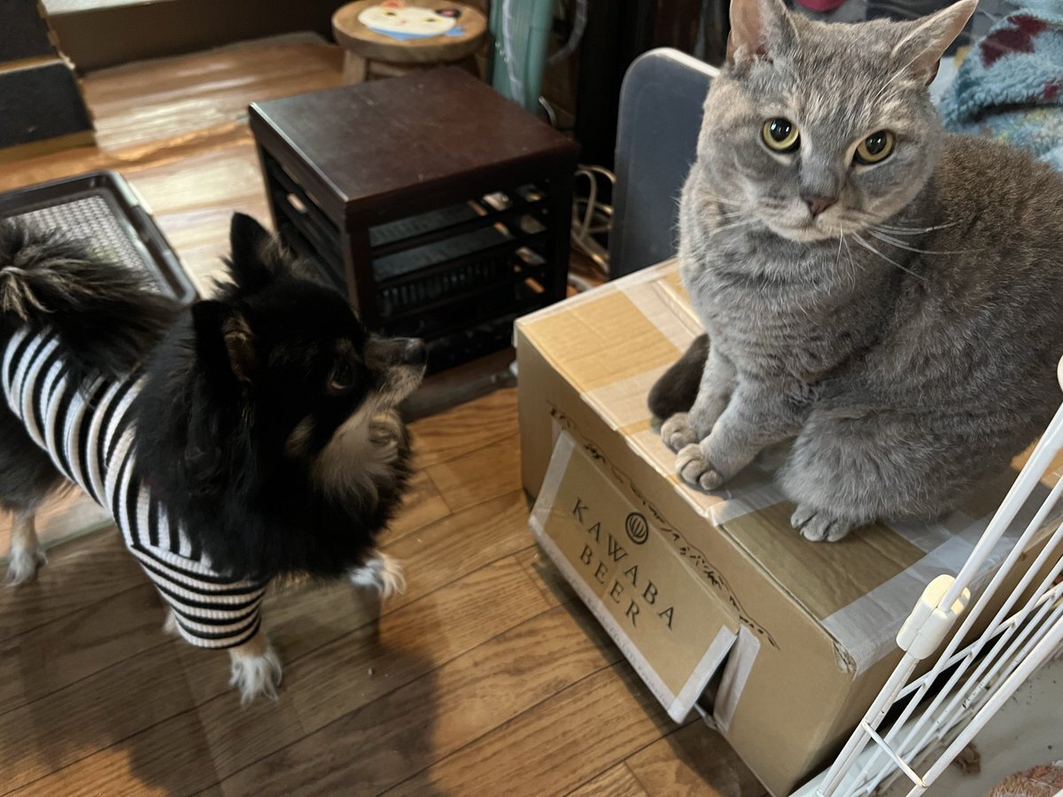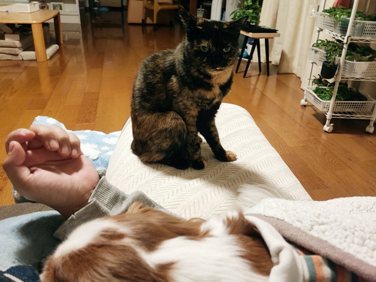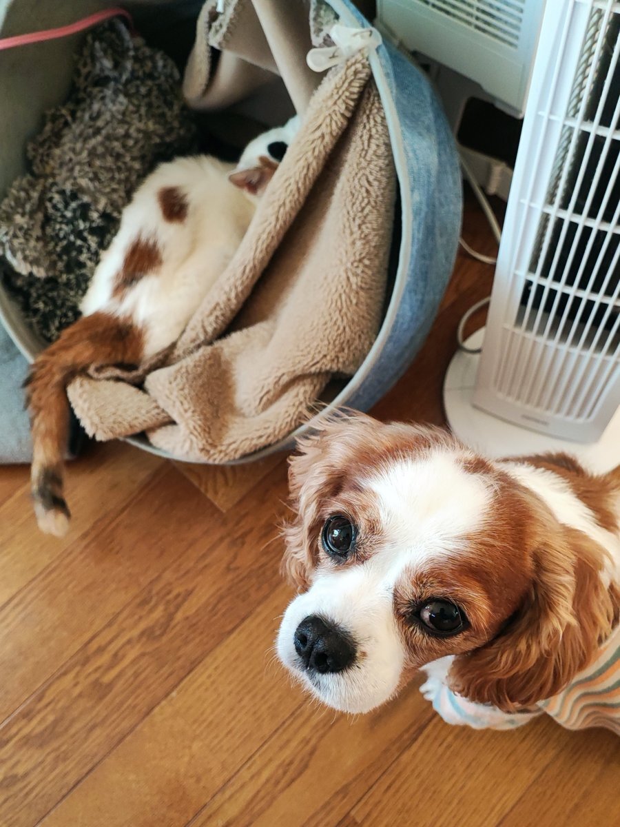 模様替えしたからひじきがわたちの場所が無くなってる!!だって。しょうがないから犬の横で我慢してる。 #犬のいる暮らし #猫のいる暮らし #猫と犬のいる暮らし pic.x.com/xokyMJwtXR