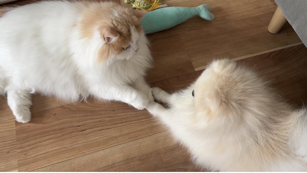 寒くなって前にもまして 手を繋ぐようになった 我が家のもふもふ達☁️☁️ #猫のいる暮らし #猫と犬のいる暮らし pic.x.com/DGoLdsOW1k