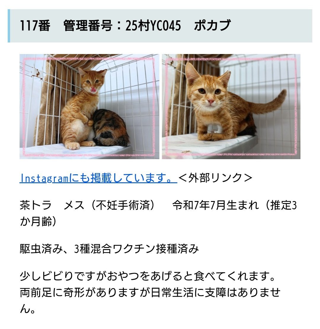 #新潟県 #譲渡猫 #譲渡可能猫 #猫の飼い主さん募集 #下越動物保護管理センター #新しい家族を待っています 🔴連絡先🔴 #下越動物保護管理センター ☎0254-24-0207 pref.niigata.lg.jp/site/shibata-k… 🟢ポカブちゃん🟢 pic.x.com/wd7q4OjDVl