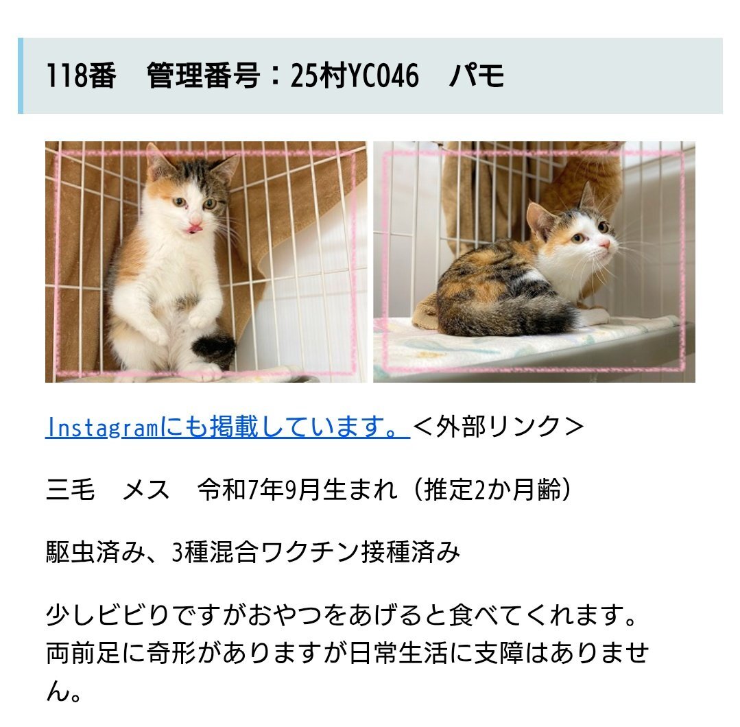 #新潟県 #譲渡猫 #譲渡可能猫 #猫の飼い主さん募集 #下越動物保護管理センター #新しい家族を待っています 🔴連絡先🔴 #下越動物保護管理センター ☎0254-24-0207 pref.niigata.lg.jp/site/shibata-k… 🟢パモちゃん🟢 pic.x.com/OVffi2s5cE
