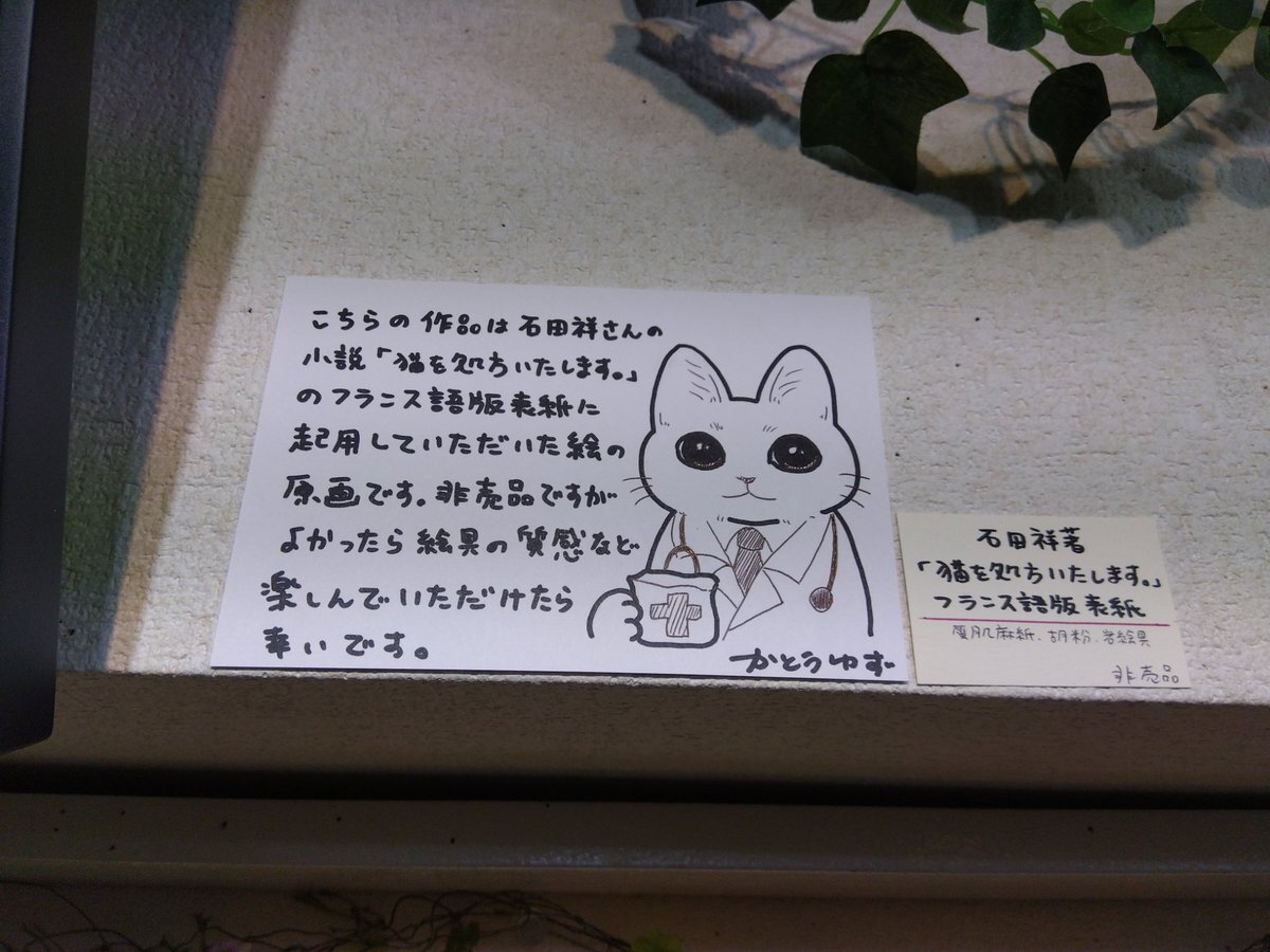 高円寺の #猫の額 さんで開催中の 個展「ねこども園」で かとうゆず @YuzuKato2 さんが描いた、 #石田祥 さんの小説 「#猫を処方いたします 」のフランス語版の表紙が展示されてます! ゆずさんのかわいい絵がいろいろな表紙や絵本になるといいな♪😊 お写真は、ゆずさんに許可をいただきました。 pic.x.com/mGdXFbkxd1