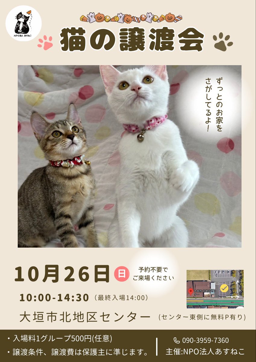 いつも🫶やRT有難うございます! 明日の10:00~大垣市北地区センターにて猫ちゃん達の譲渡会行います🐱✨ 可愛い子達がずっとのおうちと家族を待ってます🥺 是非是非会いに来て下さい〜! #あすねこ #岐阜県 #大垣 #猫 #保護猫 #地域猫 #TNR #譲渡会 #保護猫を家族に #拡散希望RPご協力お願い致します