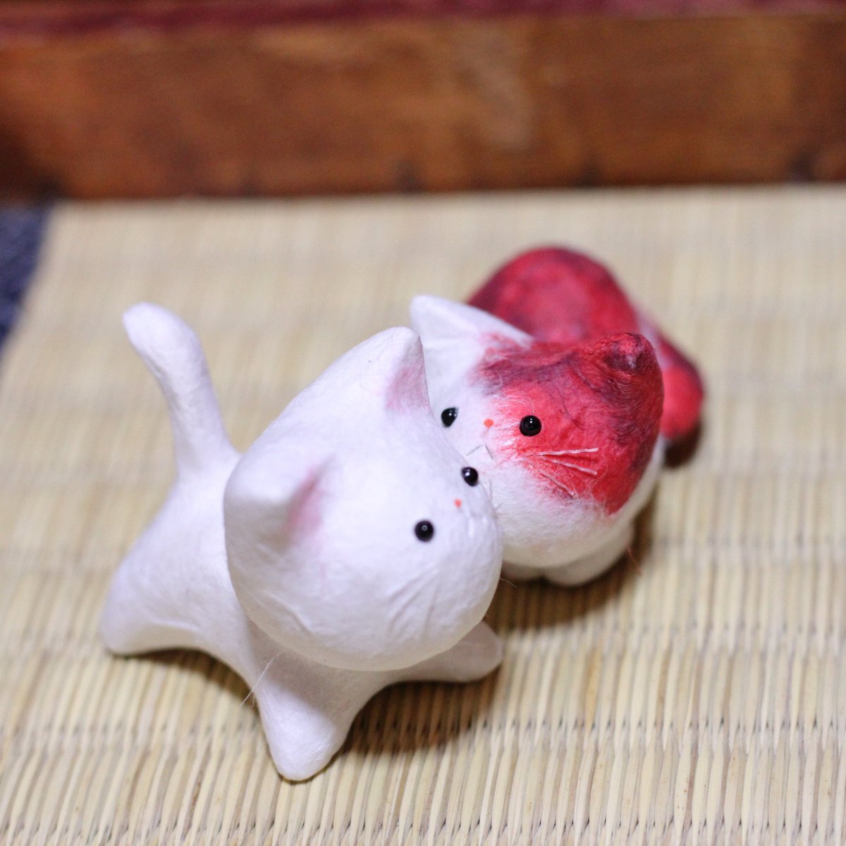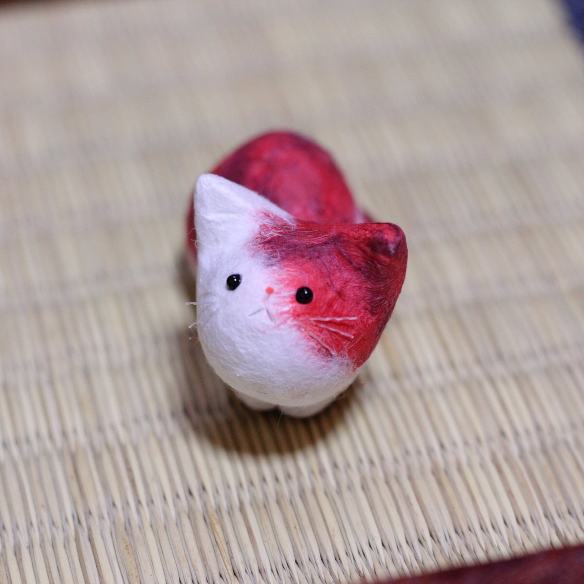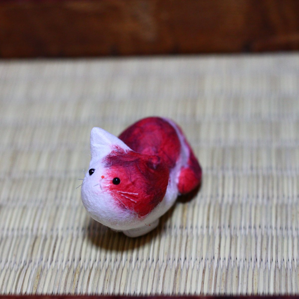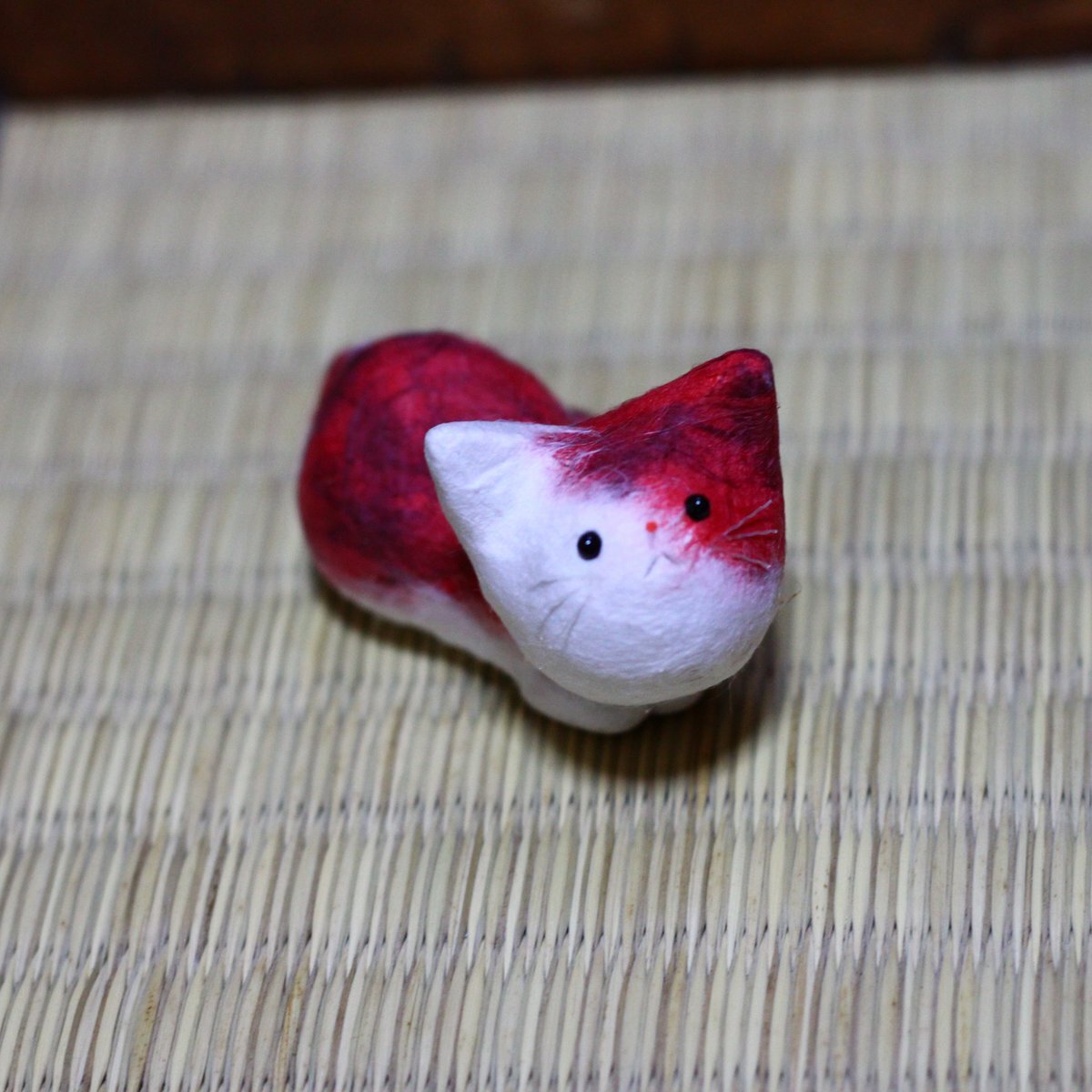 今日の #和紙ねこ 「和色ねこ」さん 結構前に生まれた子 この深い赤色が特徴なのです。 深緋色と紅緋色だったか #和紙雑貨 #猫雑貨 #手作り屋CMY #立岩和紙 pic.x.com/IyQOWdH6Kc