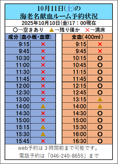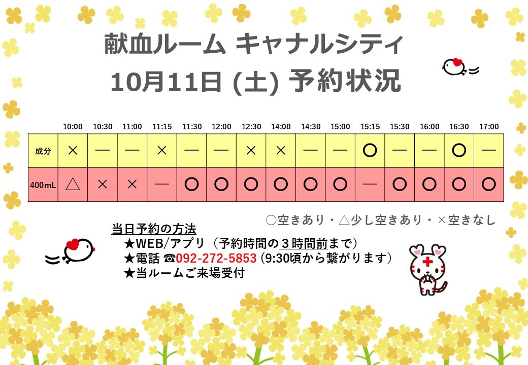 【献血ルーム キャナルシティ】#閉所まであと12日 本日(10/10)#献血 にご協力いただきました皆様、ありがとうございました。 明日(10/11)のご予約状況をお知らせします。 お時間ございましたらご協力をお願いします! 皆様のご来所お待ちしております😀 #福岡 #キャナル pic.x.com/shkOfm6Jp3