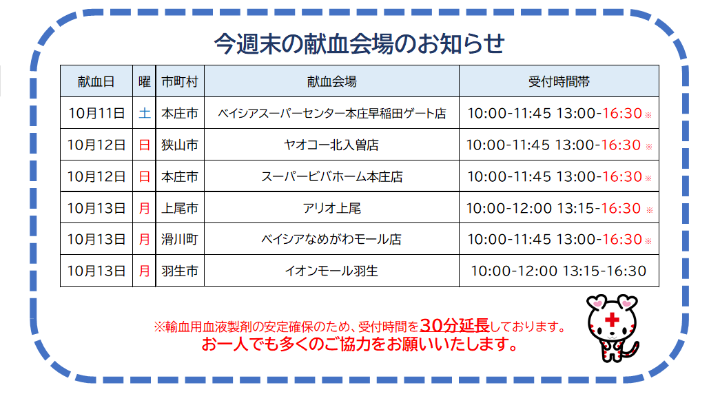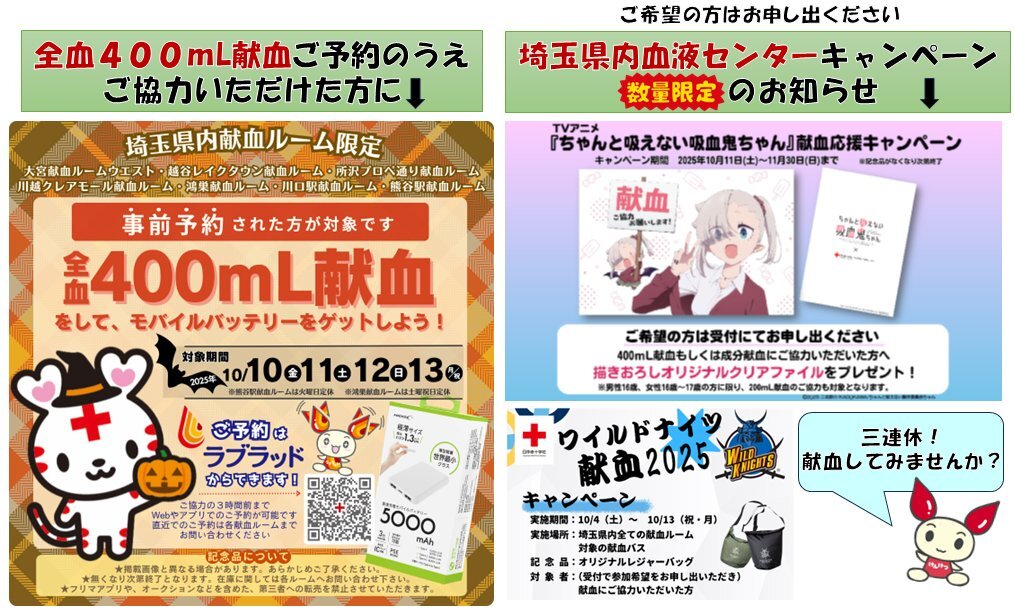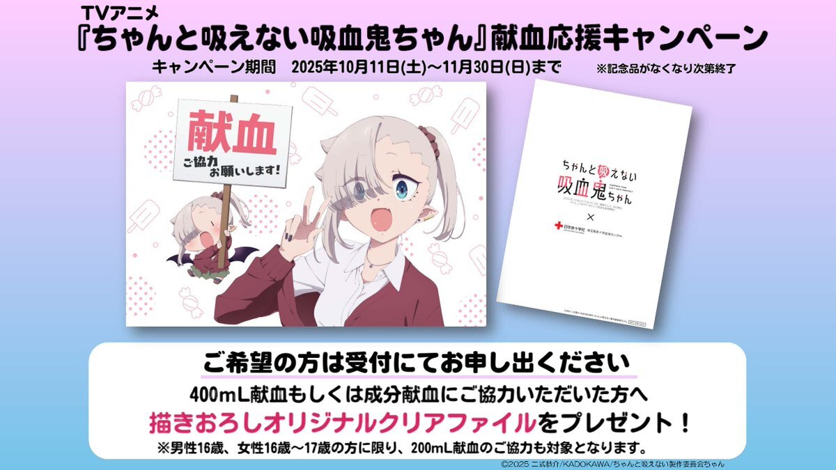 📣#3連休 の #献血 にご協力を! 輸血用血液製剤の安定確保のため、献血バス会場におきまして受付時間を延長いたします。 そして10/11から #ちゃんと吸えない吸血鬼ちゃん 献血応援キャンペーン開始🎶 他にもキャンペーン盛り沢山でお待ちしています🙇♀️ 運行スケジュール✅x.gd/FBLMp pic.x.com/fWnPbZyZRz
