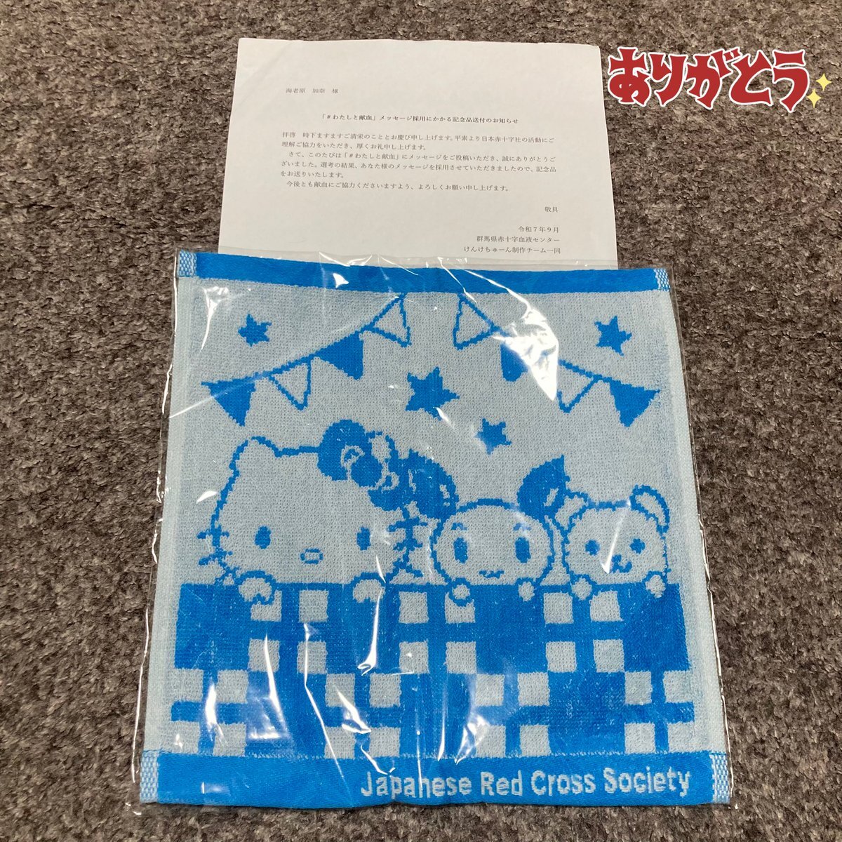 ㊗️ #当選報告 ㊗️ 群馬県赤十字血液センターさんから #わたしと献血 の投稿が採用されたようで、記念品のハンドタオルをいただきました😍😍 ありがとうございます😭激カワすぎる👼 採用されると思ってない文すぎてかえって申し訳ないので🤯、近々またちゃんと投稿しようと思います🙇♀️ #献血 pic.x.com/m7XKCygsx5 x.com/ebiharasan0212…