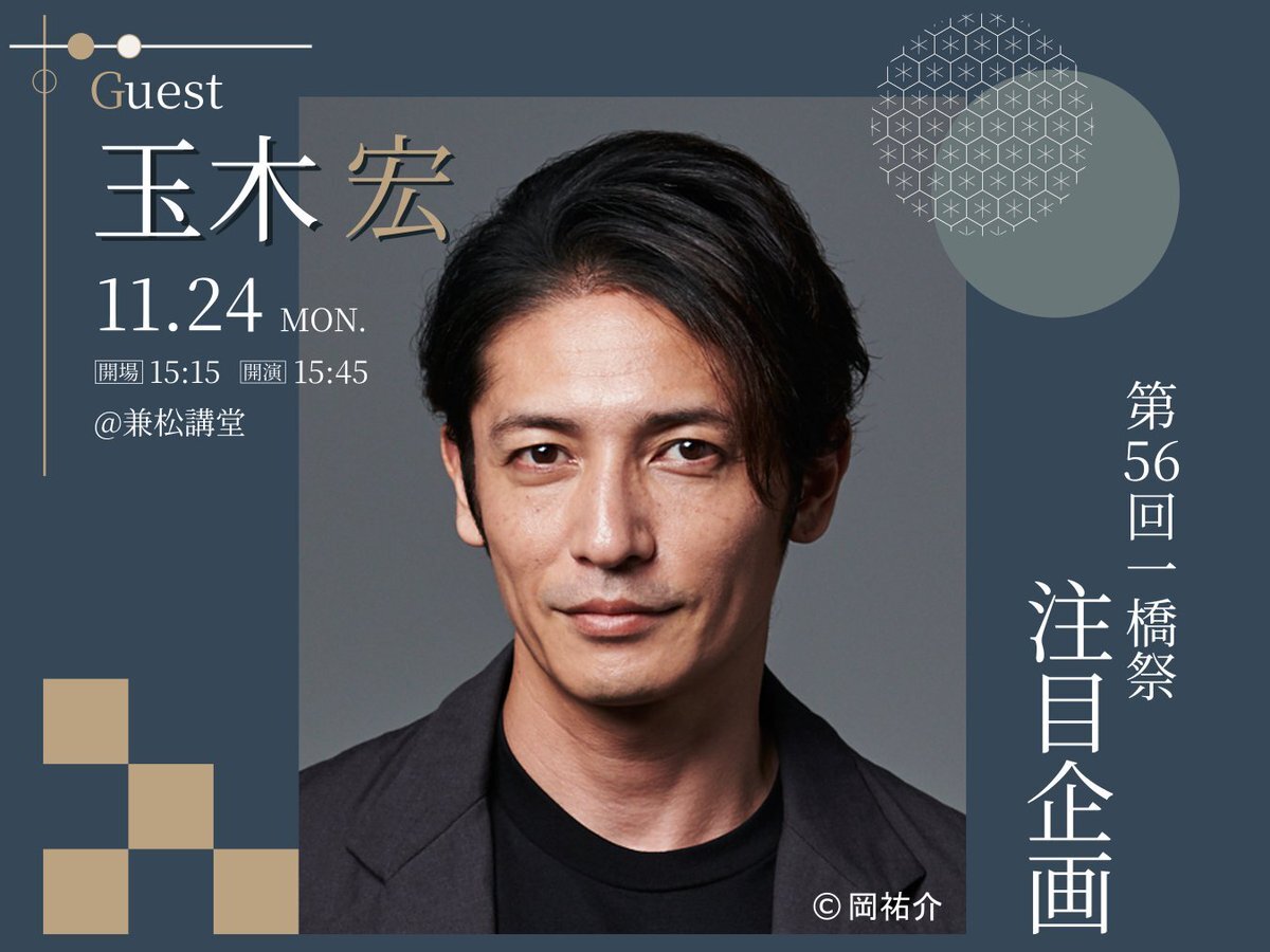 【注目企画ゲスト発表📣】 第56回一橋祭の注目企画のゲストは… 俳優の#玉木宏 さんに決定しました🎉🎉 一橋祭最終日の11/24(月・祝)に兼松講堂でトークショーを開催します!! ※観覧には有料のチケットが必要です。 詳細はこちら↓ ikkyosai.com/visitor/56/gue… #玉木宏 #一橋祭 #さあ染め上げろ一橋祭