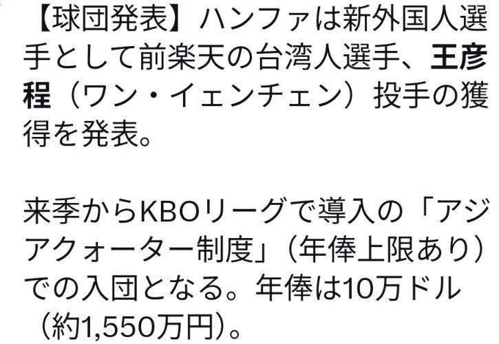 KBO/ハンファが東北楽天/王彦程投手(24)と契約合意。 来季より導入される、アジアクォーター枠での契約合意(総額10万ドル)との報。アジア枠は最大20万ドル(サラリー/インセンティブ/トレードマネー込み)で、東北楽天にはトレードマネーとして10万ドル前後が支払われる見込み。sportschosun.com/baseball/2025-…