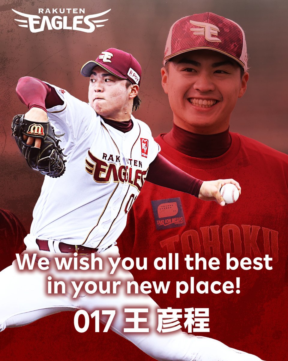 #王彦程 選手がハンファ・イーグルス(韓国)へ移籍することになりましたのでお知らせいたします。 王選手、7シーズンありがとうございました。 今後の活躍を応援しています! #RakutenEagles pic.x.com/JHBRZJ6q33 x.com/15297616737786…