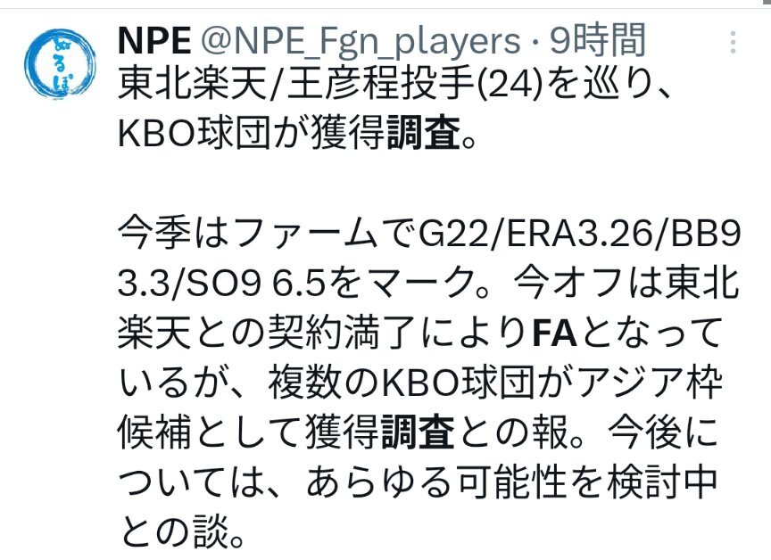 移籍金入るのかよ それだったらなおさら市場価値上げてから放出しろよなあのGM #rakuteneagles #eaglesfarm #王彦程 x.com/NPE_Fgn_player…