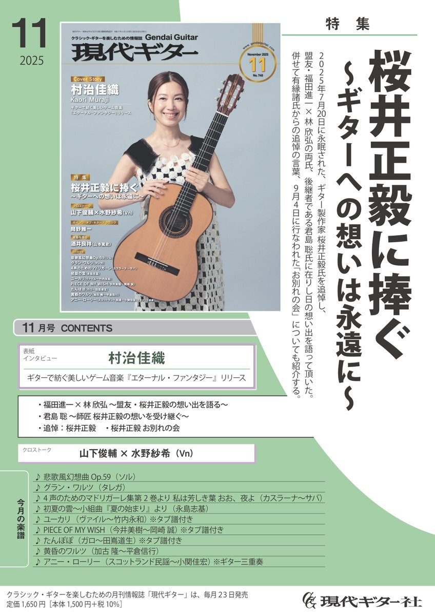 【楽譜】現代ギター 11月号が入荷いたしました♪ 《特集》桜井正毅に捧ぐ ~ギターへの想いは永遠に~  福田進一×林 欣弘 ~盟友・桜井正毅の想い出を語る~  君島 聡 ~師匠 桜井正毅の想いを受け継ぐ~ 《インタビュー》村治佳織 #クラシックギター #現代ギター #桜井正毅 #村治佳織 pic.x.com/hXVgOdqZQO