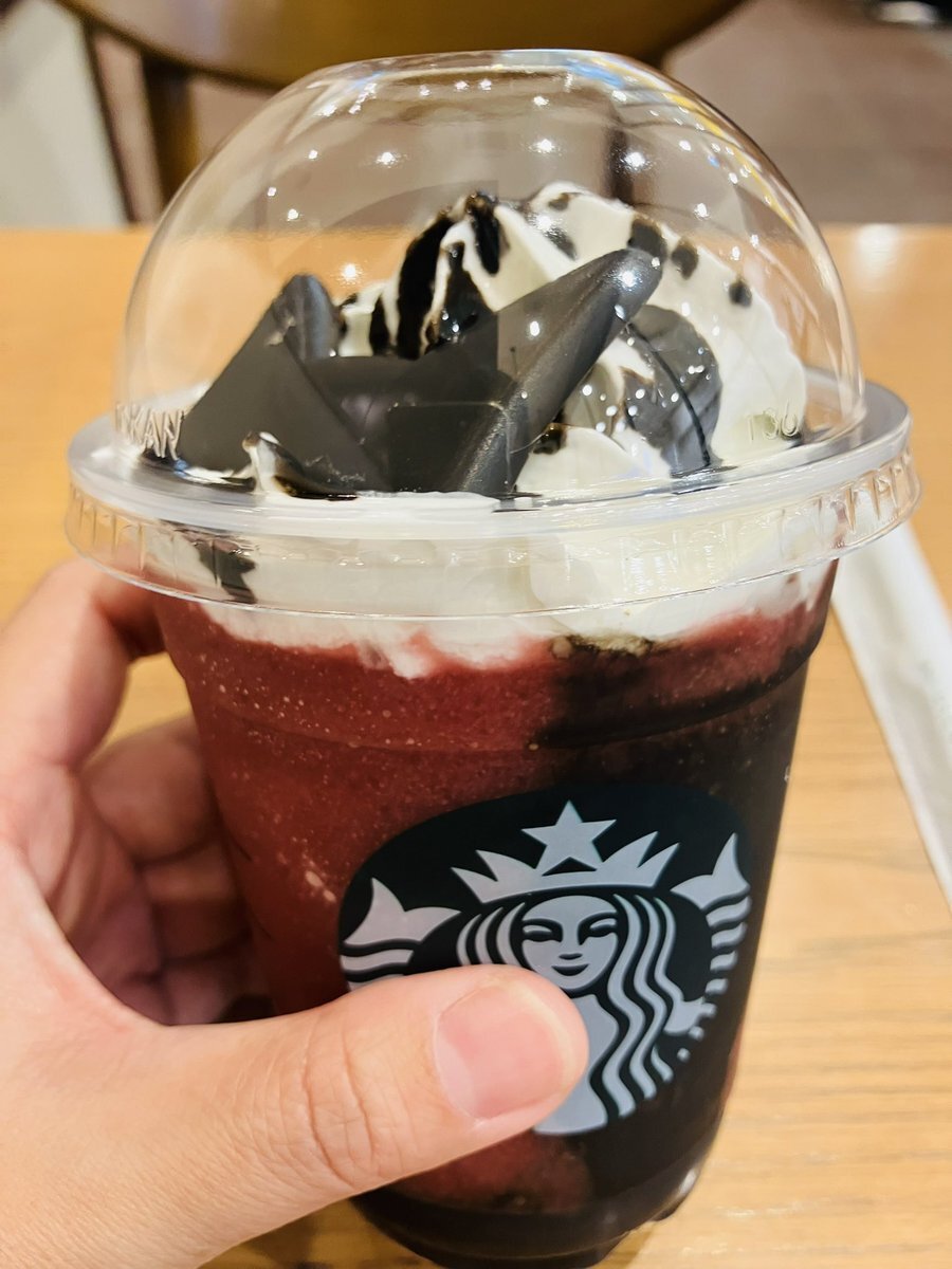 #現場に憧れる事務員のつぶやき 黒猫フラペチーノ #スタバ新作🐈‍⬛ #アサイーベリーフラペチーノ アサイーのフレッシュな酸味と カカオの香りが合うー✨ 甘いチョコ系ではなく 見た目と反してサッパリしてます 猫耳はどうやって食べよう🤔‥ #企業公式つぶやき部 #企業公式相互フォロー pic.x.com/Txejj3vk0J