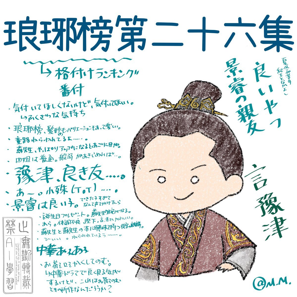 『琅琊榜第二十六集』 言豫津 ٩( ᐛ )و 言候 言闕の子。言皇后の甥。琅琊榜公子榜第10位。蕭景睿の親友。7月7日誕生日。妙に感が鋭い所はさすが言候の息子という感じ。芸事に明るく紀王と仲良し。夏冬が苦手。本当に良いやつ 大好きです(*´꒳`*) #琅琊榜 #琅琊榜を見る会 pic.x.com/MCJW0L6VFE