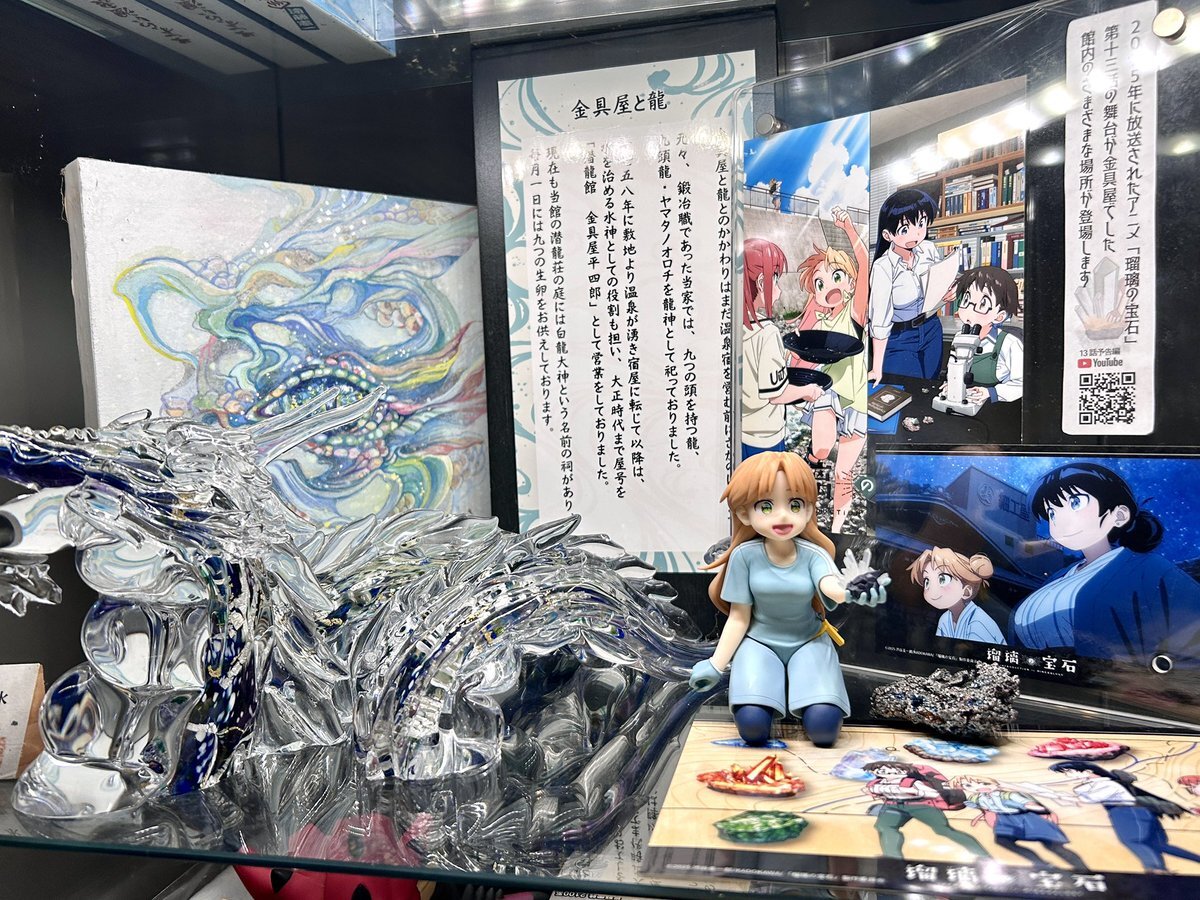 さらに!玄関脇にも展示エリアを作りました!(クレゲでお迎えした)谷川さんが二酸化ケイ素で出来た龍と並んでいます🐉 なにか面白い石があったらよかったのですがないので磁鉄鉱を極限まで生成したものを谷川さんの足元におきました(日刀保製) こちらもぜひ! #瑠璃の宝石 pic.x.com/PcWK0CTr1R