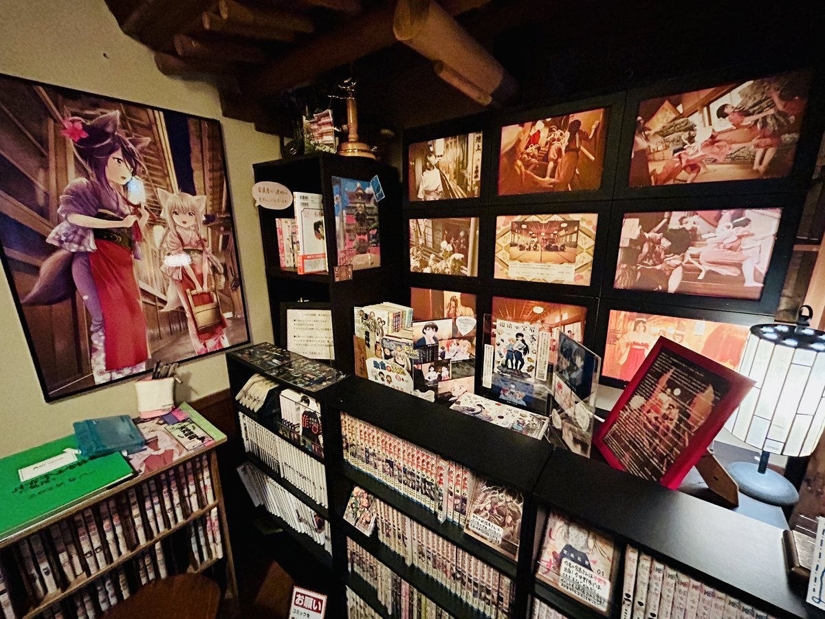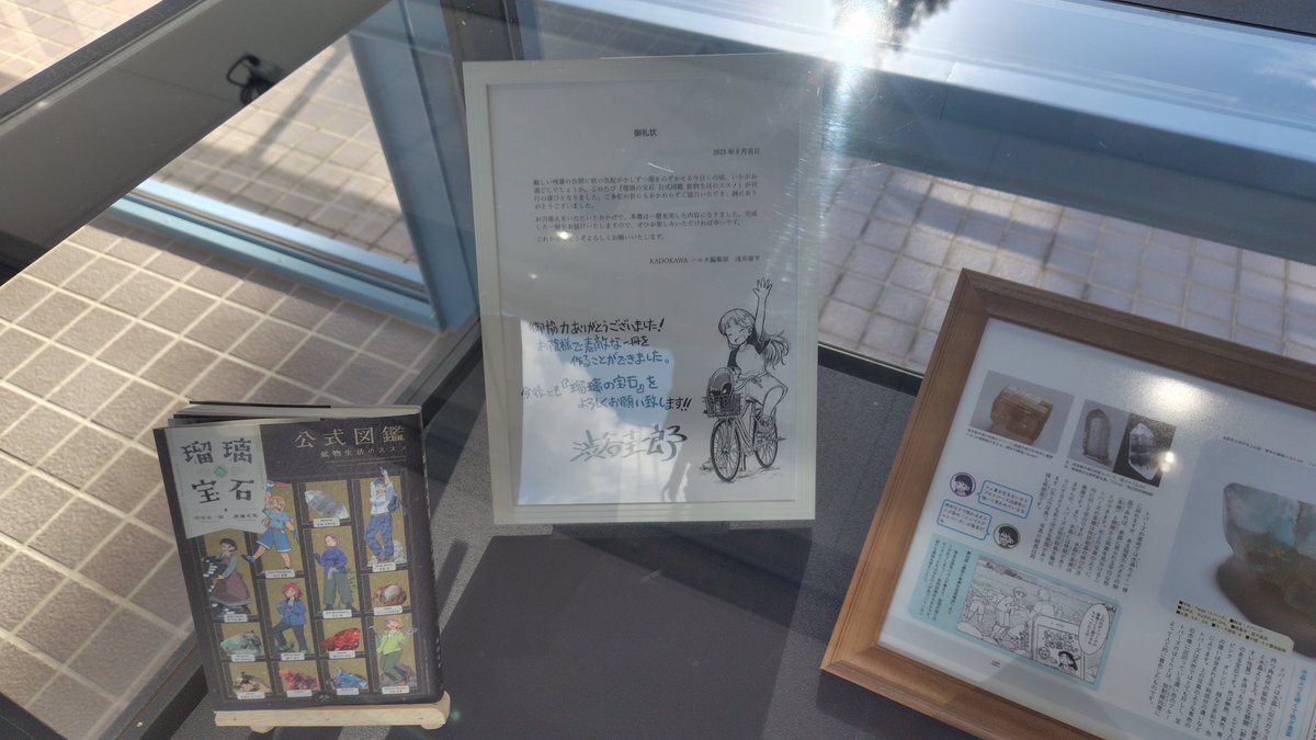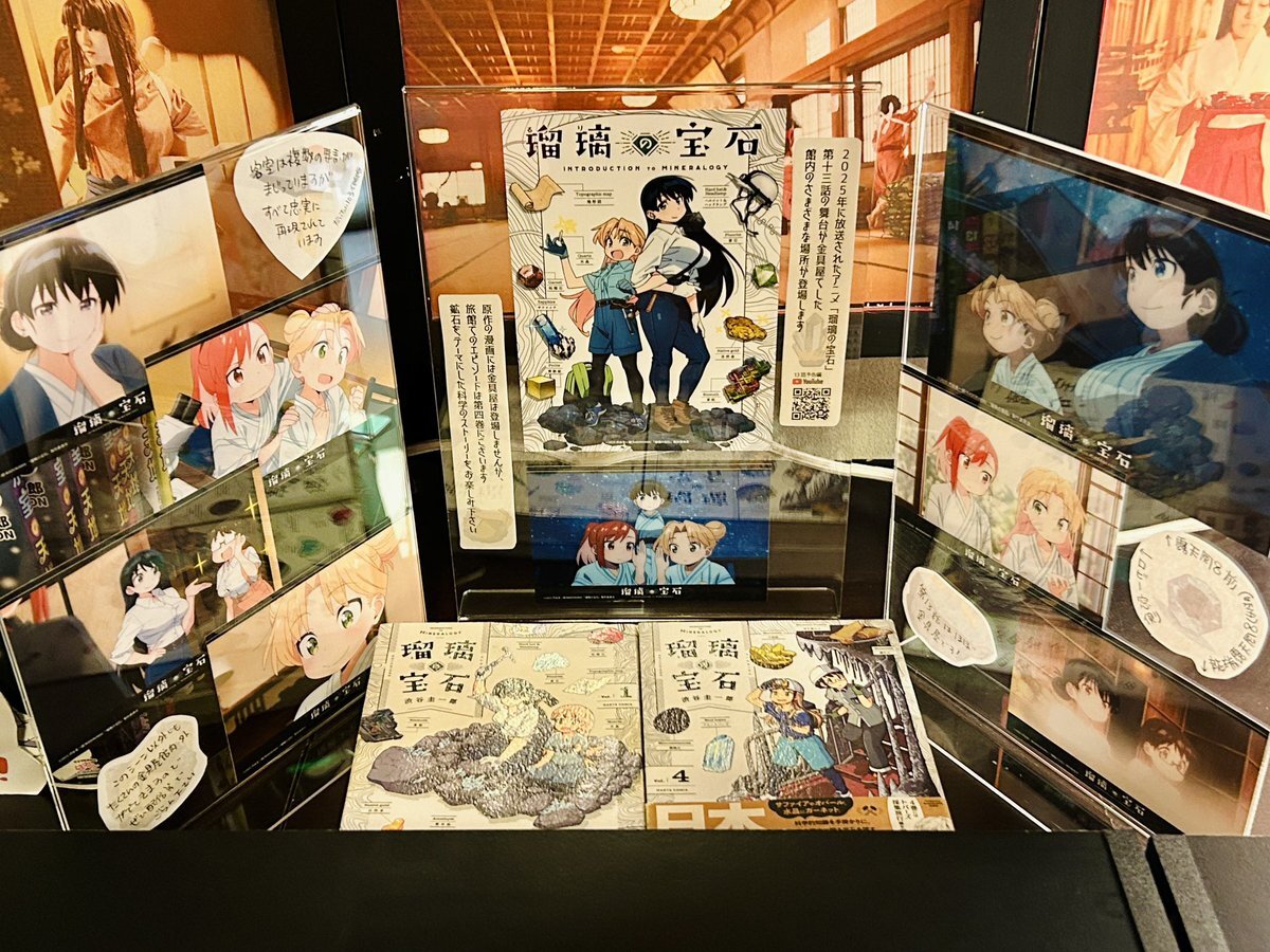というわけで、購入したローソンプリントのブロマイドを飾りまして、瑠璃の宝石ご紹介エリアを金具屋館内につくりました! 取材の時にいただいたコミック1巻から4巻も自由にご覧いただけるようになっております!金具屋にお泊まりの際はぜひご覧ください! #瑠璃の宝石 pic.x.com/iCOFFhV2xV