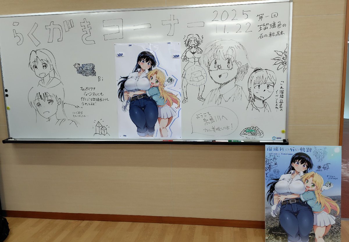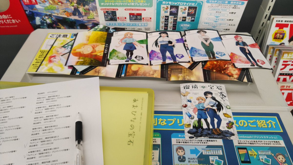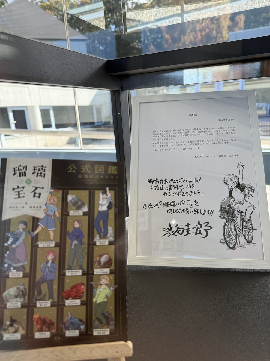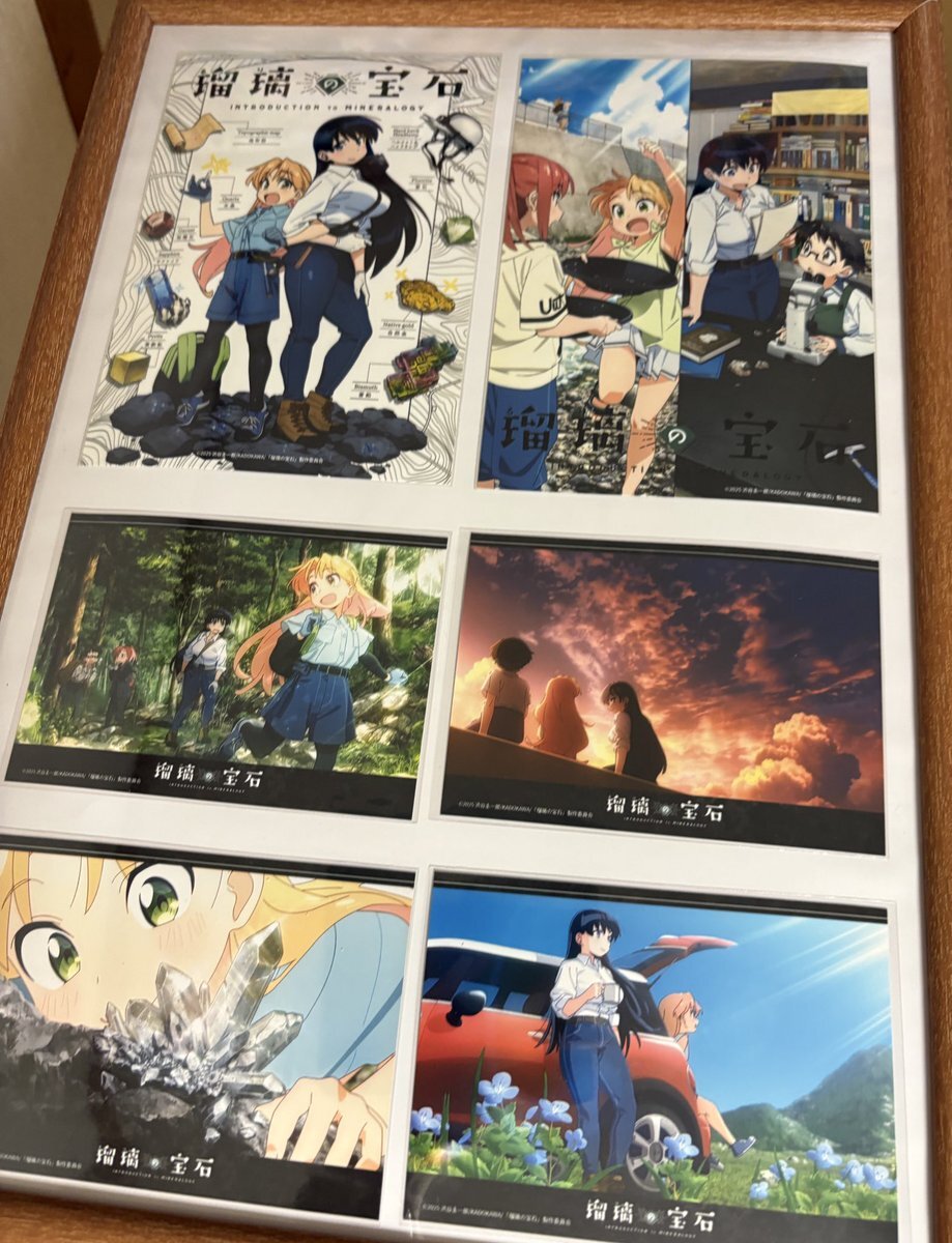 というわけで、購入したローソンプリントのブロマイドを飾りまして、瑠璃の宝石ご紹介エリアを金具屋館内につくりました! 取材の時にいただいたコミック1巻から4巻も自由にご覧いただけるようになっております!金具屋にお泊まりの際はぜひご覧ください! #瑠璃の宝石 pic.x.com/iCOFFhV2xV