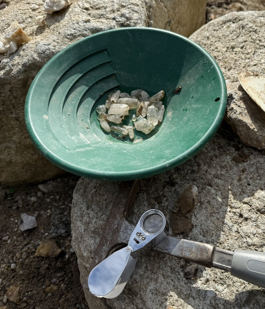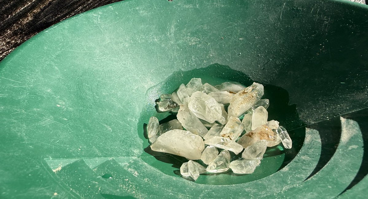 岩手で水晶拾いをやりましただ ガイド付きの初心者向けなやつですだよ 同日参加のご家族も #瑠璃の宝石 で石探しに興味を持ったそうな パンニング皿とスコップを貸してもらって30分 このくらい拾えます うちひとつをお土産に (今回はクマ対策で時間短縮の代わりにふたつ) 玉乃湯さんありがとう! pic.x.com/kPpi5tq8Ml