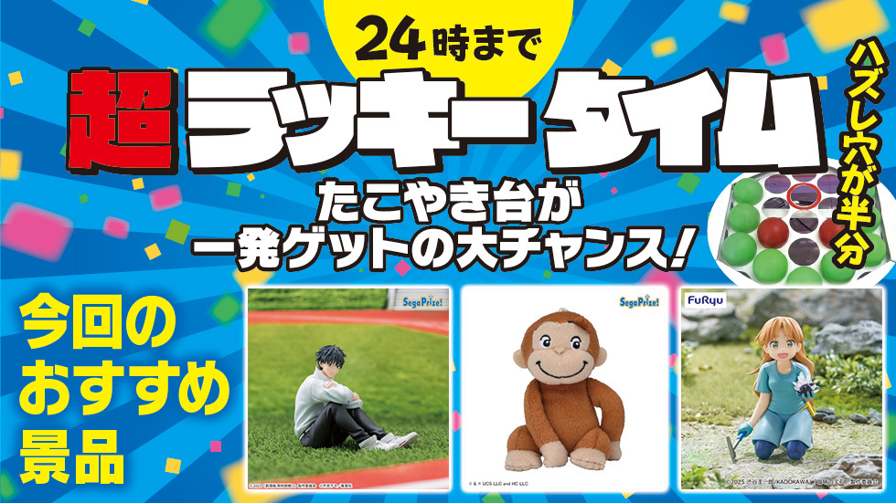 24時まで!!! 『ラッキータイム🎉』開催🌟 対象のたこやき台が穴埋めされた大チャンス!! 『#呪術廻戦🔥』『#おさるのジョージ🐵』 『#瑠璃の宝石💎』等がオススメ👍 その他にも沢山の種類の景品をご用意してます✨ #タイクレ #オンクレ ▼今すぐプレイ taito-olcg.com/web/top/ pic.x.com/i7Wy9WPwXM