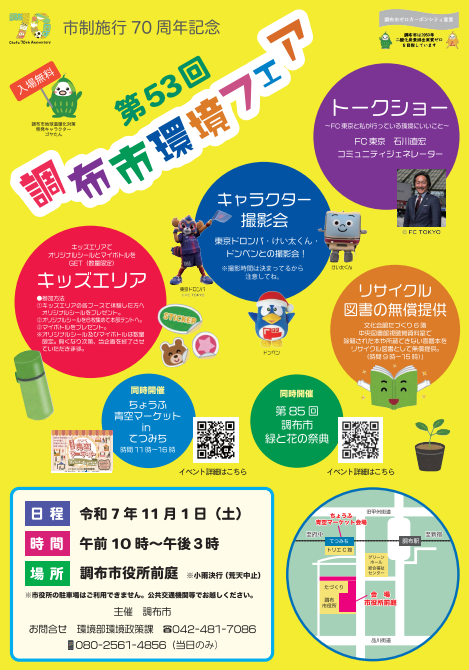 本日より開催! #調布市環境フェア 環境について考えてみよう。 日時:11/1(土)10:00〜15:00 会場:調布市役所前庭、調布市文化会館たづくり北側道路 詳細:調布市HP city.chofu.lg.jp/070010/p039377… 市制施行70周年記念 第53回(令和7年度)調布市環境フェア(予定通り開催) | 調布市 #調布市 #環境フェア pic.x.com/CgxxkbdTvs