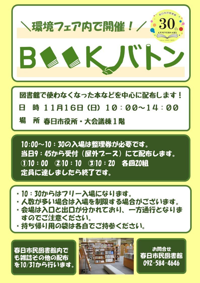 こんにちは❣️くるくるだよ😄 本日11月16日14時まで、春日市役所の大会議棟1階でBOOKバトンを開催中✨図書館で使わなくなった本などを配布しているよ~📔環境フェアの他のブースも楽しんでね🤩環境フェアについてはこちら➡️city.kasuga.fukuoka.jp/kurashi/gomi/e… #春日市民図書館 #リサイクル #環境フェア pic.x.com/1MzUiOEVB1