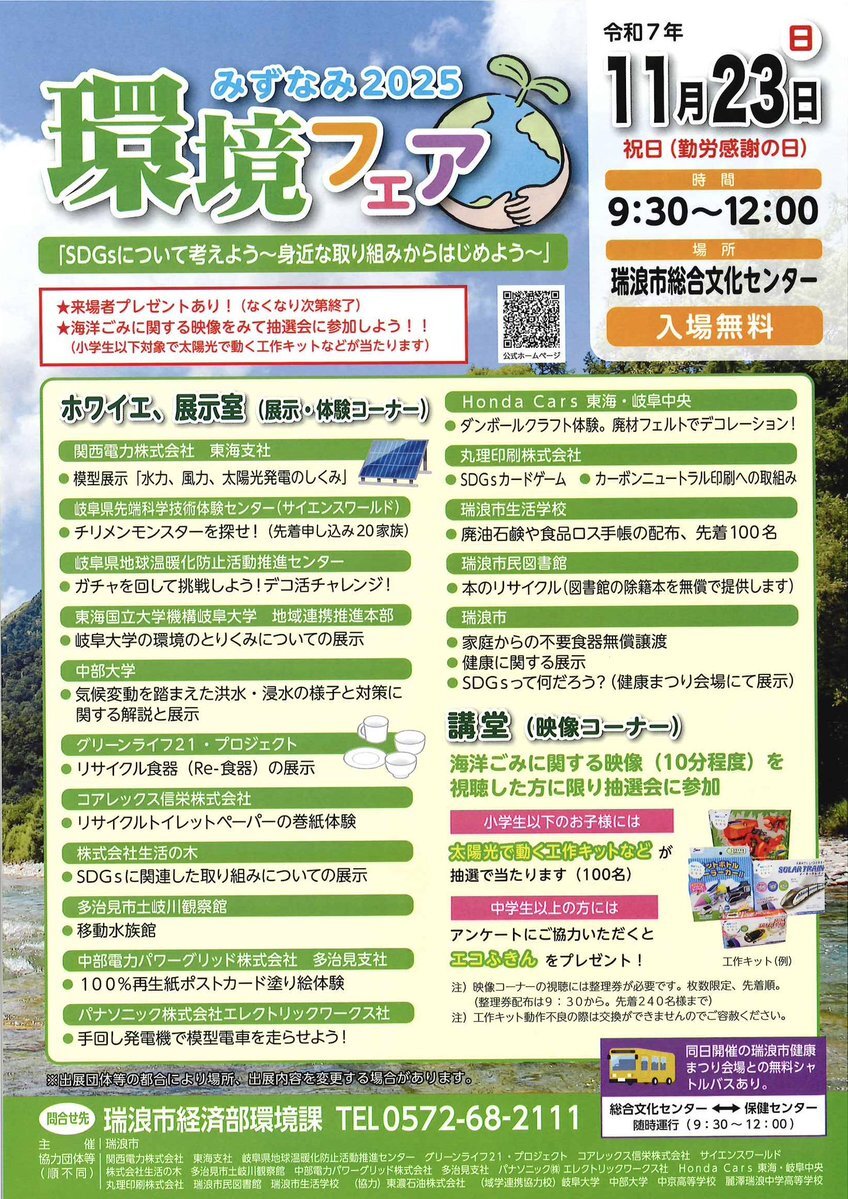 11/23(日)に環境フェアみずなみ2025を開催します🎉 様々な団体による展示・体験・クラフトコーナーなど楽しいイベントが盛りだくさんです🥳 来場者にはエコバッグをプレゼント🎁ぜひご来場ください✨ #瑞浪市 #sdgs #環境フェア pic.x.com/TqUrT5EDil