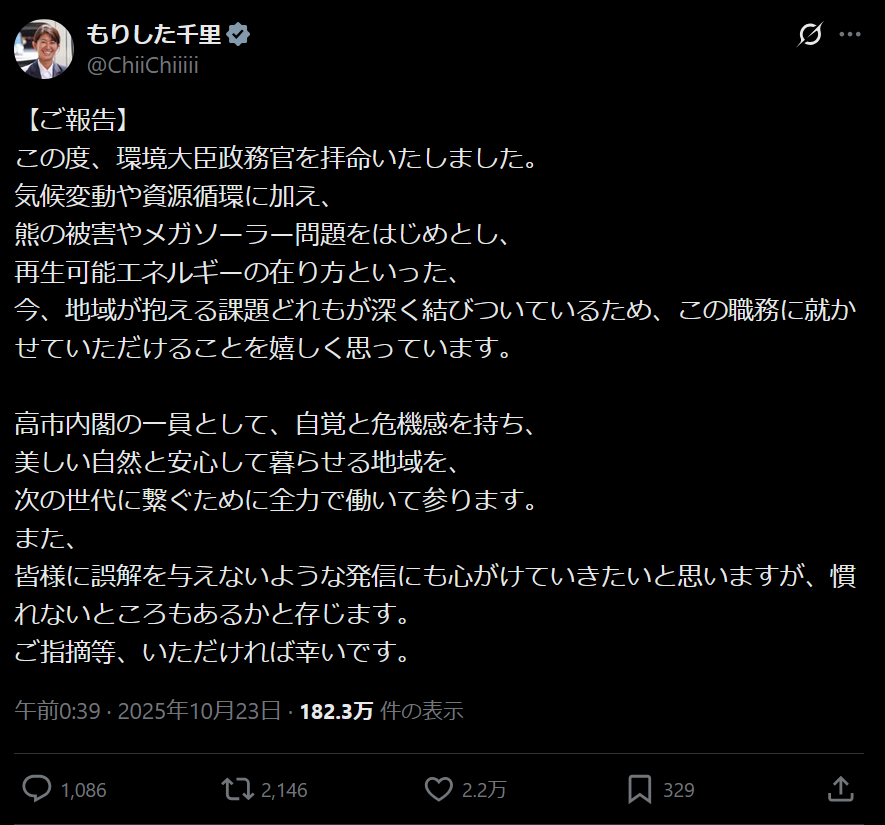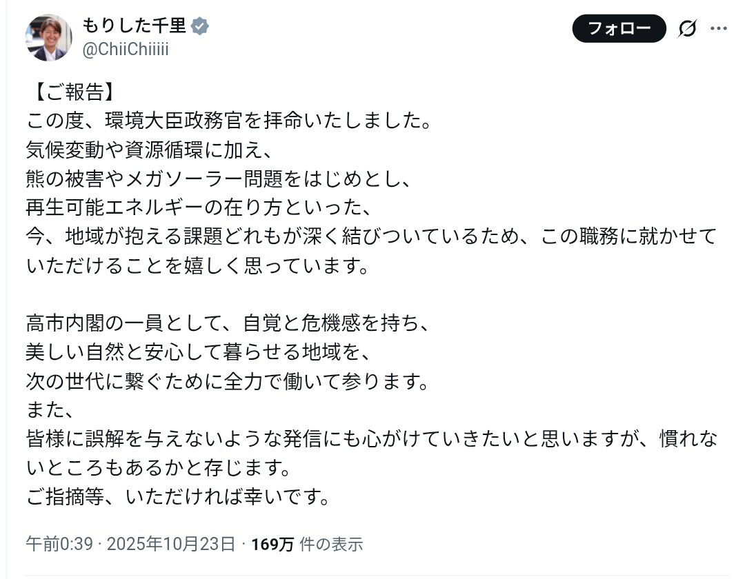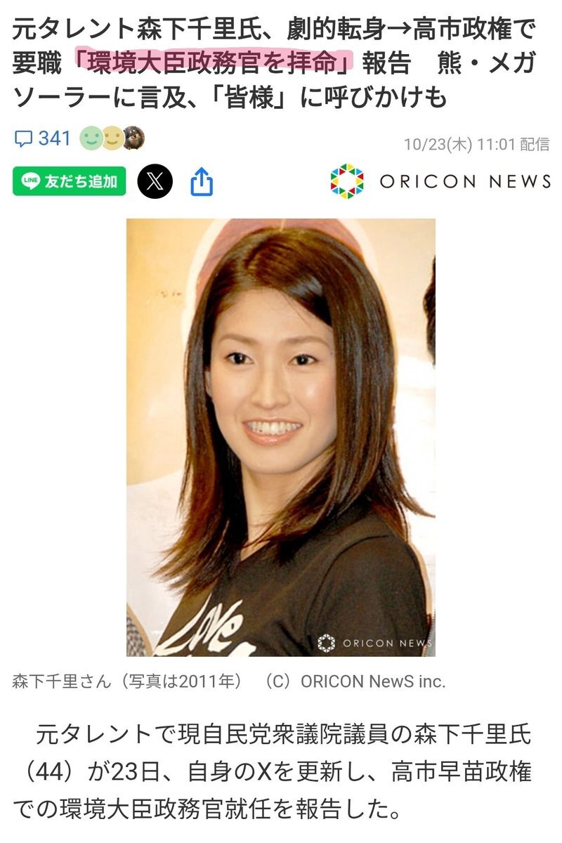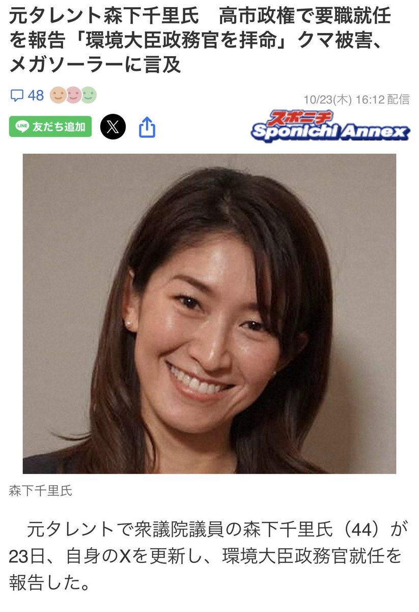 元タレント森下千里氏 高市政権で要職就任を報告「環境大臣政務官を拝命」クマ被害、メガソーラーに言及‼️ 森下千里政務官頑張れ‼️ #森下千里 #環境大臣政務官 pic.x.com/q56sk6mjG4 x.com/kennoguchi0821…